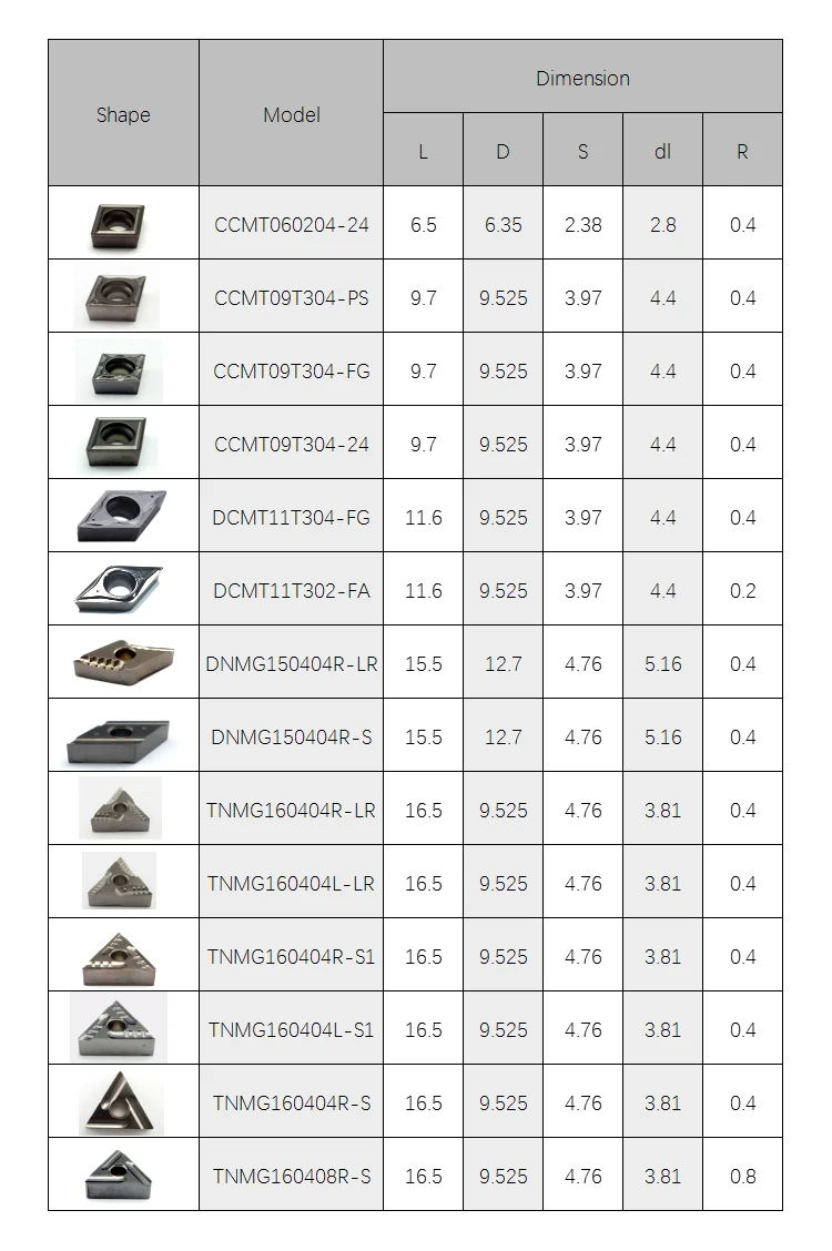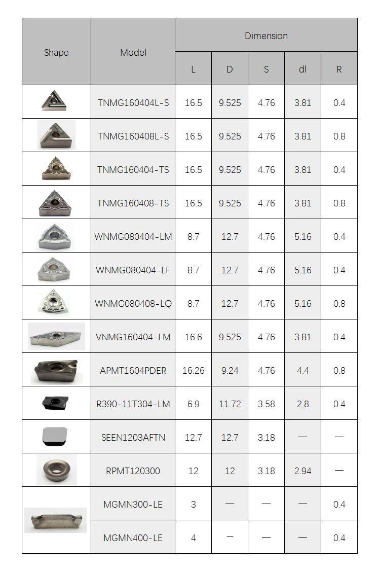 UK215 | It is suitable for finishing and semi finishing of steel parts (< 40HRC carbon steel, alloy steel, tool steel, pre hardened steel), stainless steel (< 35HRC), cast iron (< HB350) and aluminum alloy series. Excellent strength, fracture toughness and surface finish. |