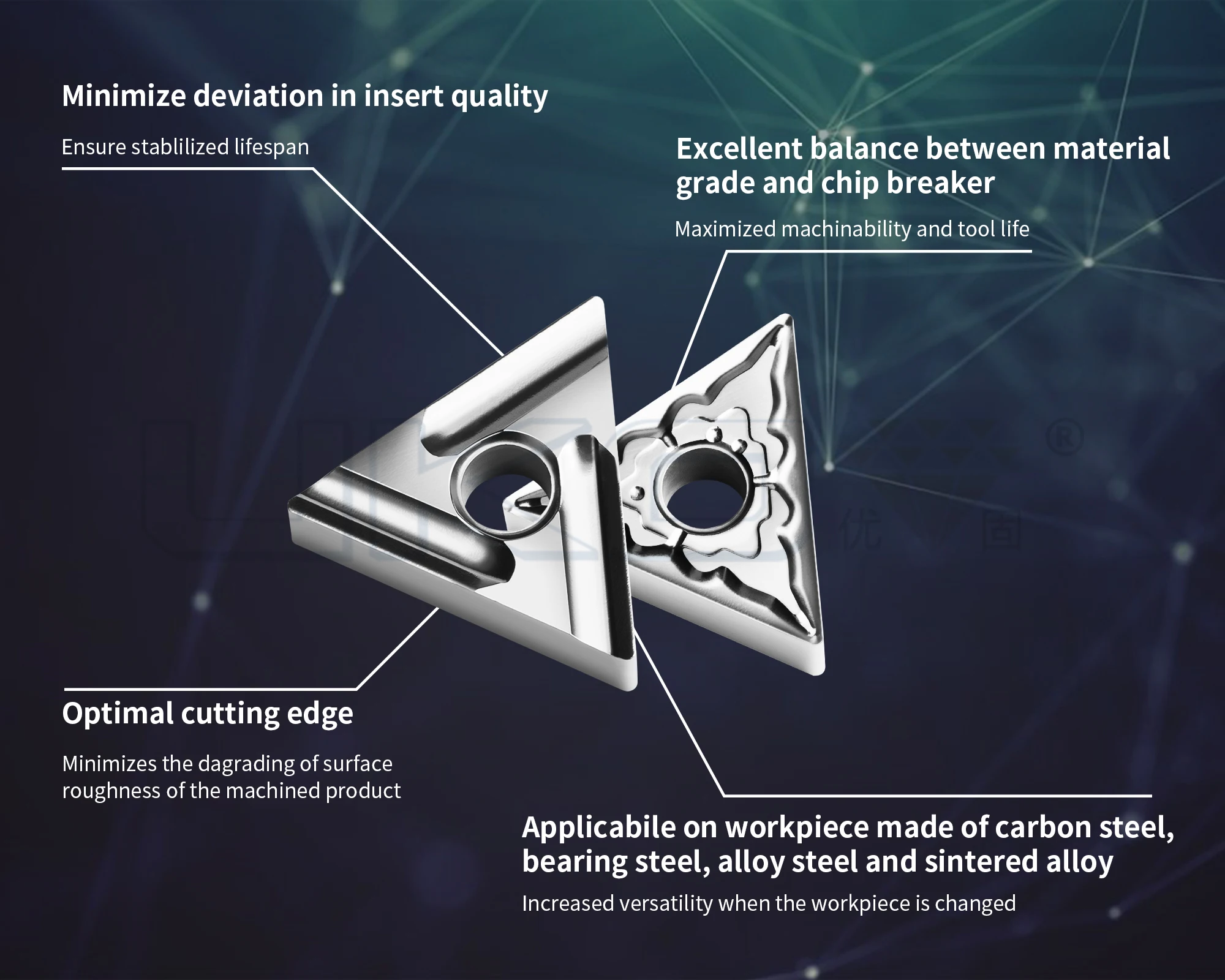 UK225 | It is suitable for finishing and semi finishing of steel parts (> 40HRC carbon steel, alloy steel, tool steel and pre hardened steel). High wear resistance, high strength and toughness, excellent surface finish. |