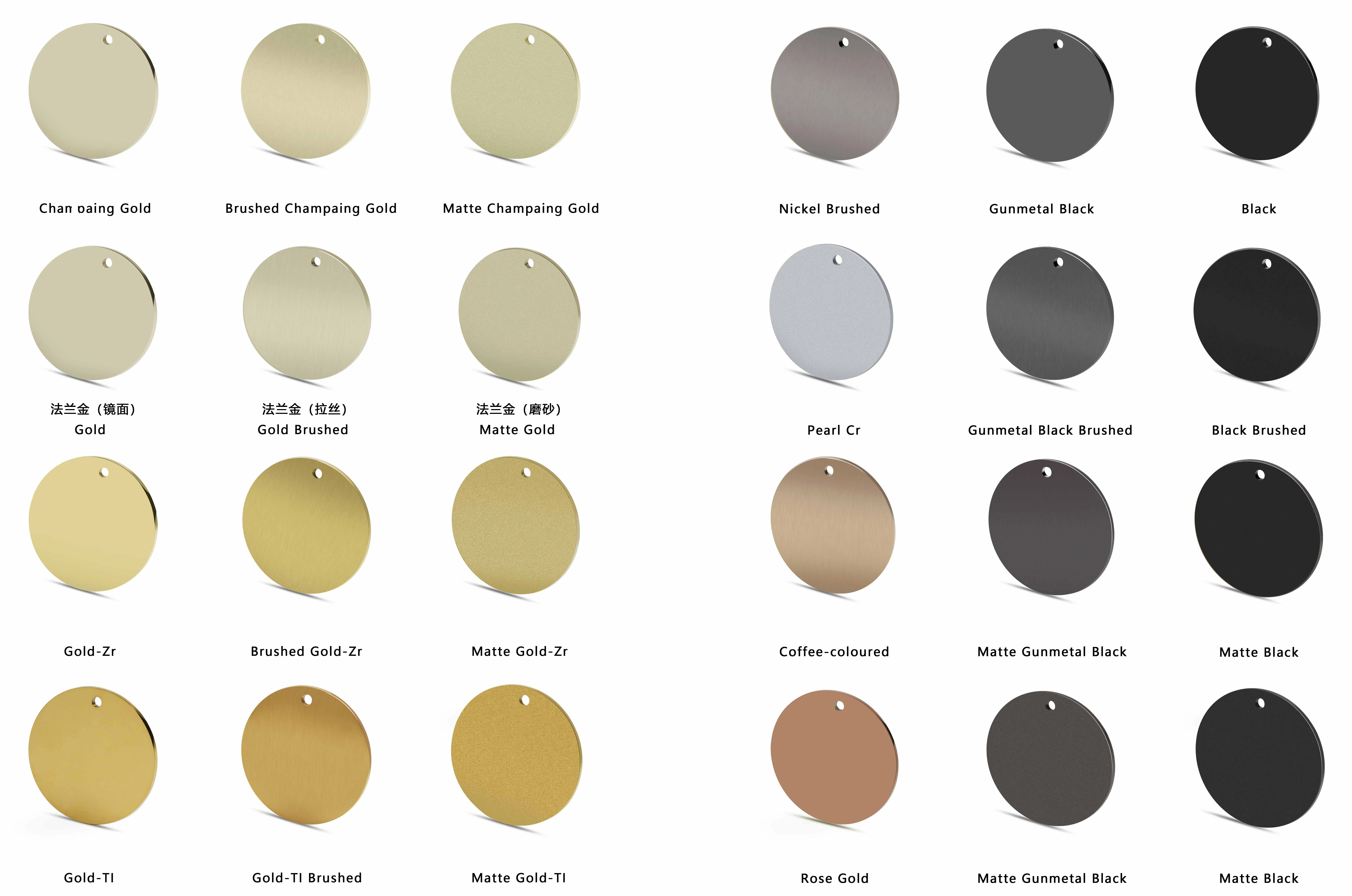 black, gunmetal black, ice black, brushed gunmetal black, gold, champaign gold, rose gold, matte gold, brushed gold, champaign