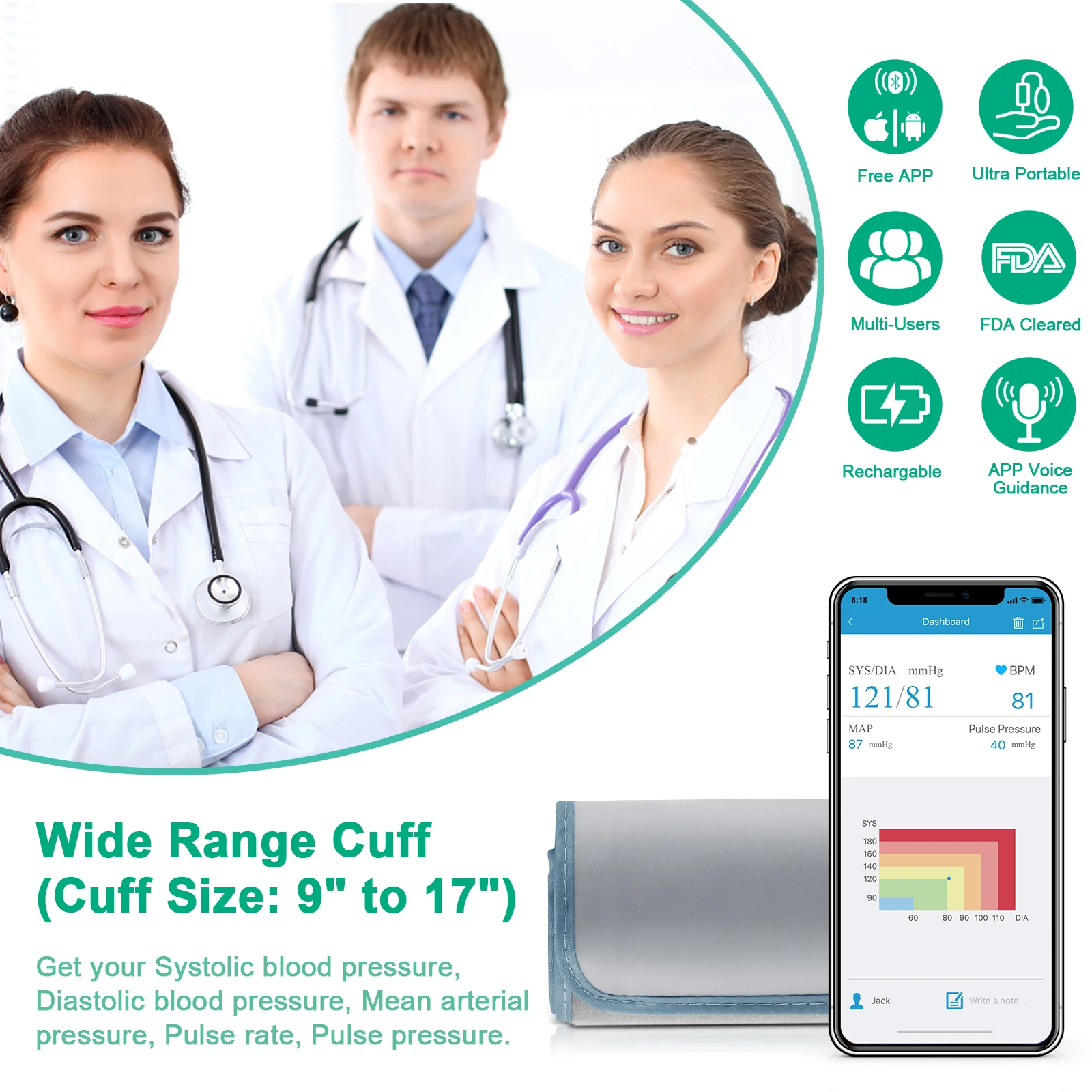 ✔ Shows SYS, DIA, MAP, PP, PR results