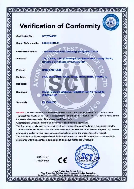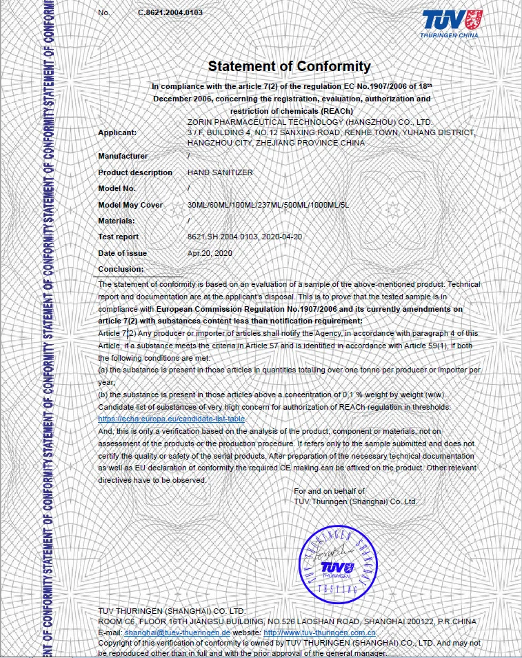 Zorin Pharmaceutical Technology (Hangzhou) Co Ltd is a professional manufacturer of daily chemicals products and established in 2019. There are 80 employees and we have an experienced management team, professional and well-trained engineers.Our company can provide Hand sanitizer,hand liquid soap,antibacterial liquid soap,shampoo,shower gel,detergent liquid,dishwashing liquid,bleach, disinfectant, glass cleaner, kitchen cleaner, all purpose cleaner, pet shampoo and stain odor remover and all the cleaning products to global customers. .All our products have passed strict quality control and been issued certification of REACH, EN, CE,GMP, ISO9001, MSDS. OEM and ODM is welcomed