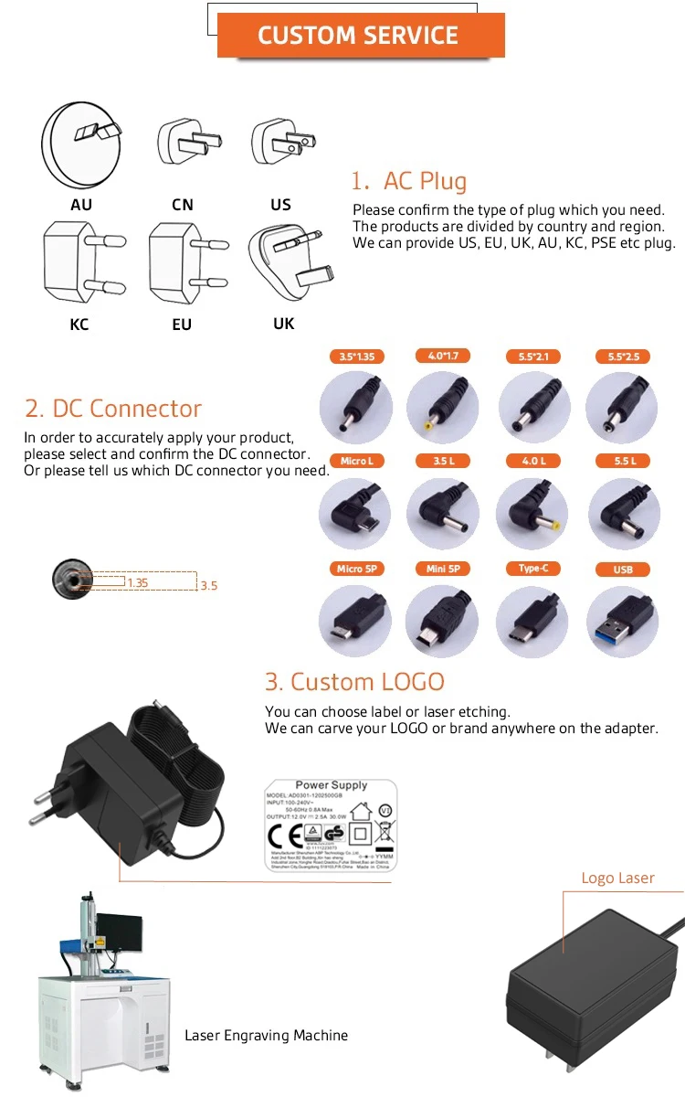 DC jack size | 5.5*2.1mm, 5.5*2.5mm, 3.5*1.35mm, 3.5*1.0mm, 4.0*1.7mm, 2.5*0.7mm .etc | ||