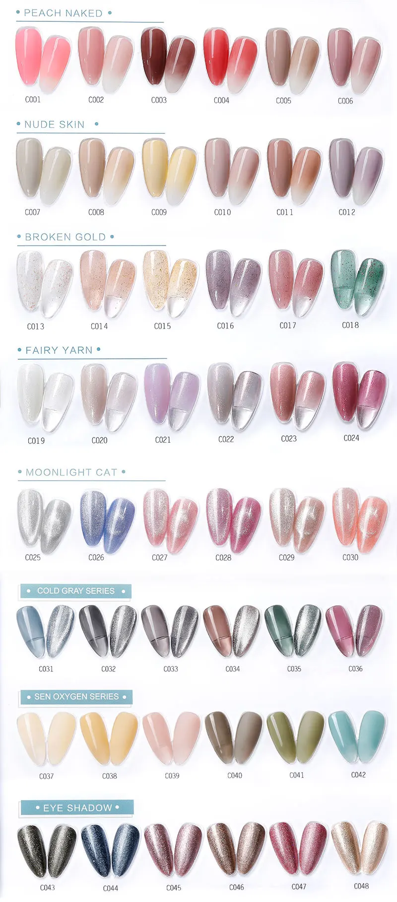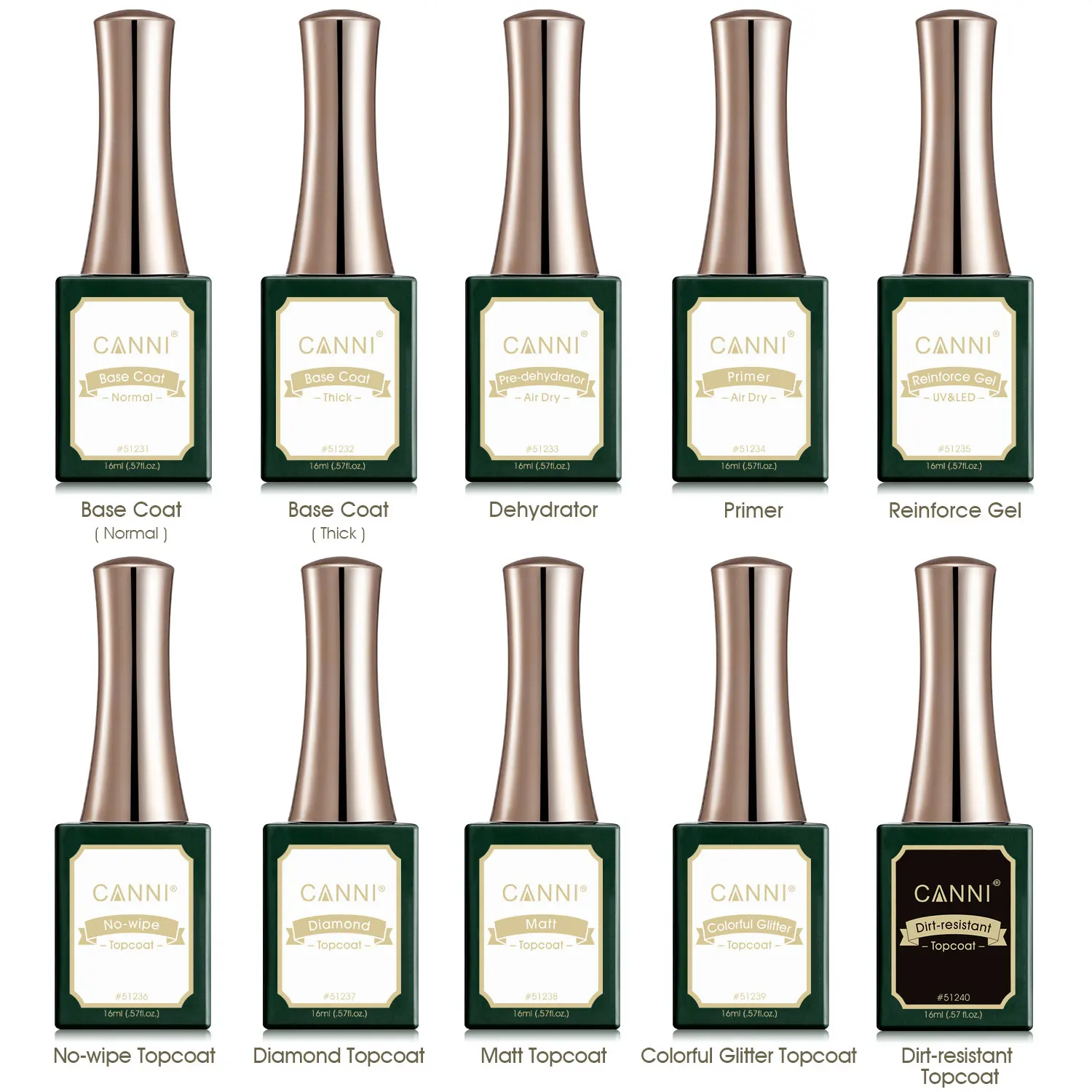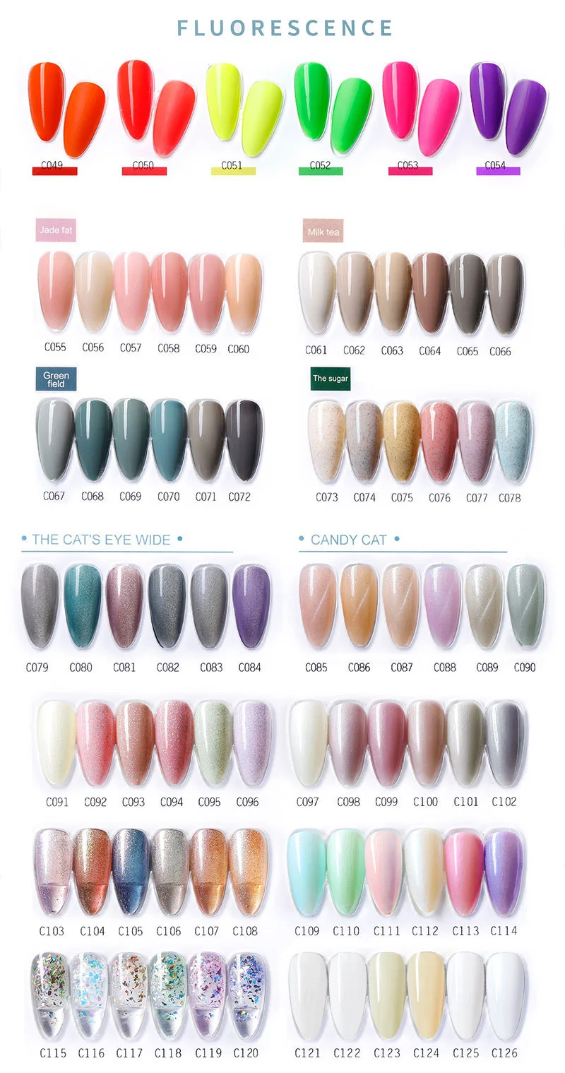 Primer, Base Coat,Topcoat, Chameleon/Cat Eye Gel Polish, Painting Gel, Extending Nail Builder Gel, 3D gel etc. All products are