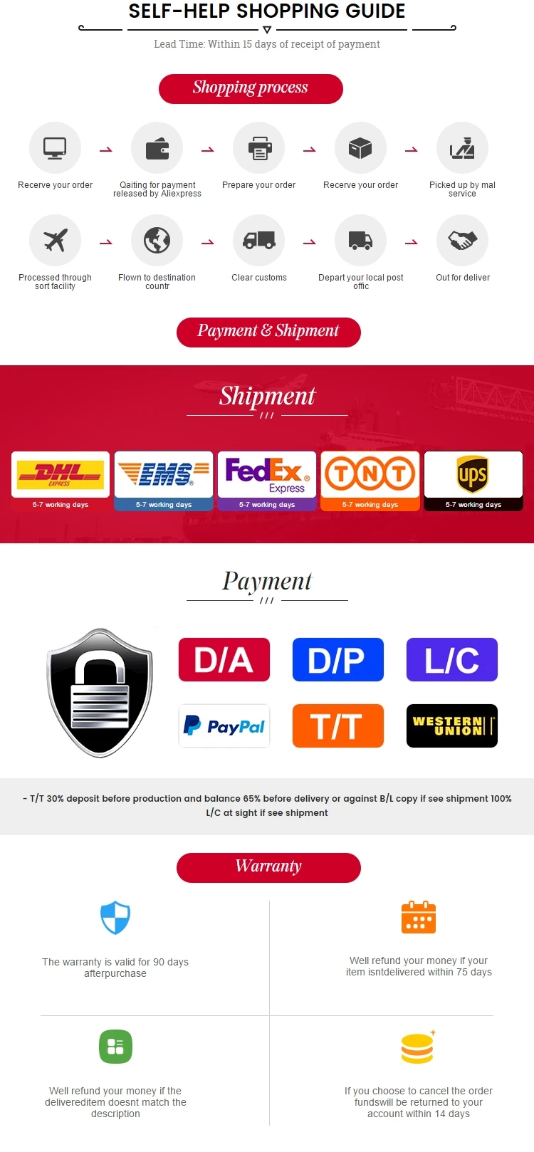 Для заказного заказа время доставки составляет около 60 дней. С апреля по сентябрь для пикового сезона срок доставки будет продлен соответствующим образом. С октября по март в межсезонье доставка будет должным образом сокращена.
