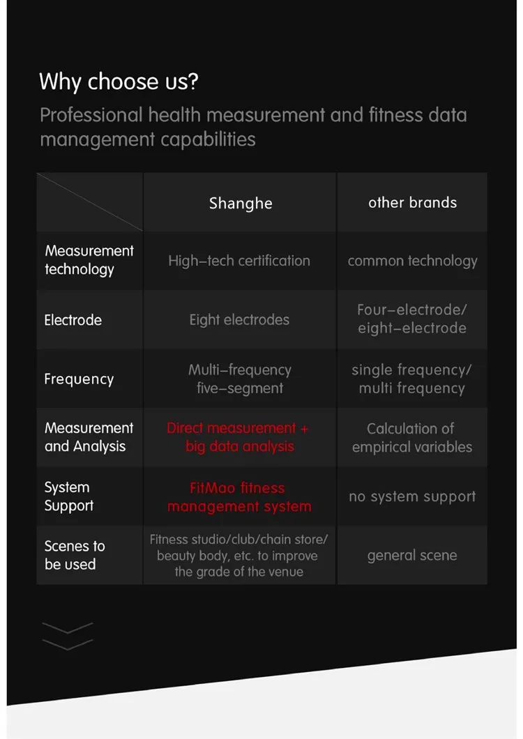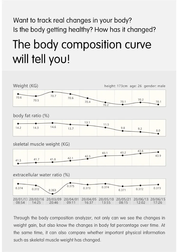 Fat weight, total water, protein, inorganic salts, body fat percentage, body water percentage, skeletal muscle percentage, visceral fat level, body mass index BMl, basal metabolism, bone mineral content, extracellular fluid,intracellular fluid impedance, body weight, Lean body mass, composite score, body age, segmenta fat mass (limbs + trunk), segmental muscle mass limbs + trunk), segmental fat ratio (limbs + trunk) | |