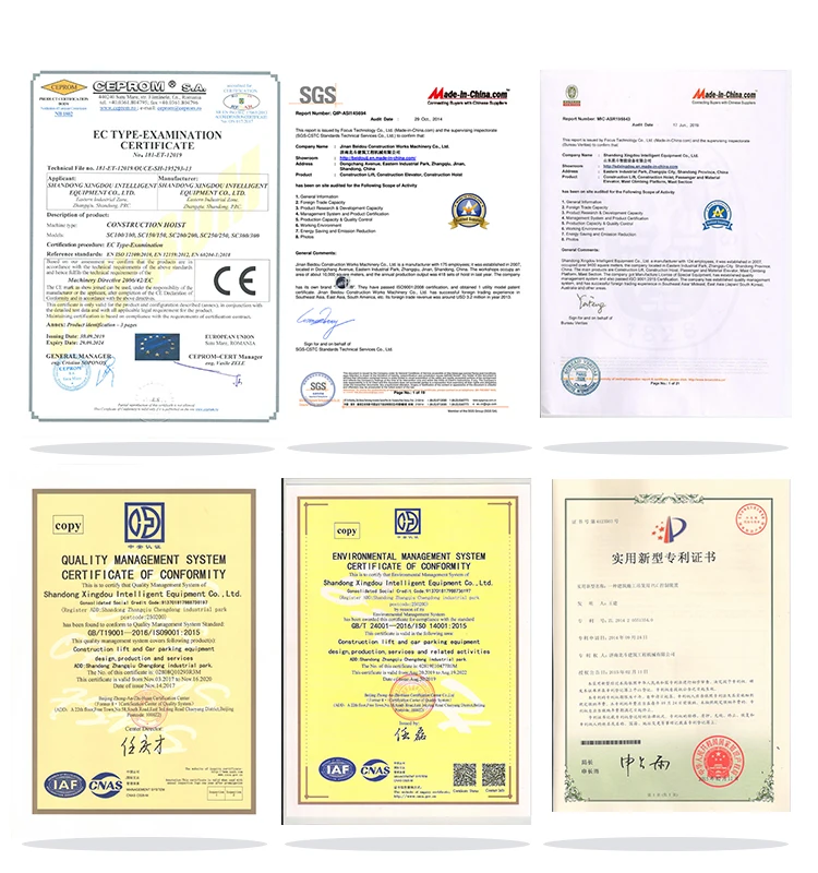 4.- Each mast climber mast climbing work platform should be test and make record in Factory, all details will be adjust like motor brake, safety device operation, all limit switch operation, dropping test, loading test, and mast section erection test to ensure the completed equipment run well when take into use.