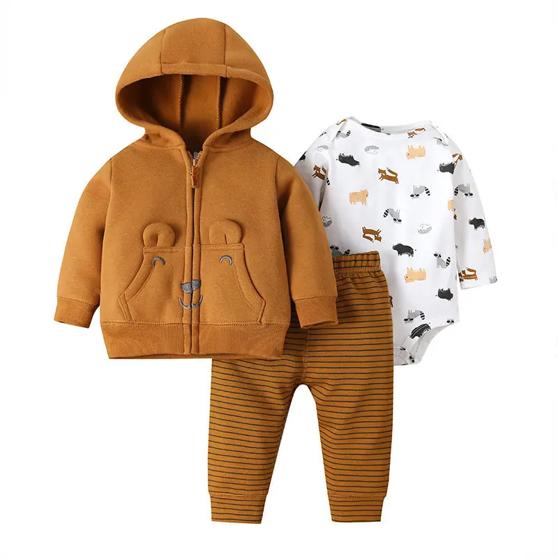 3PCS infant baby boy clothes sets cartoon animals bear 2021 fall winter warm hooded coat +bodysuit+pants newborn baby outfits