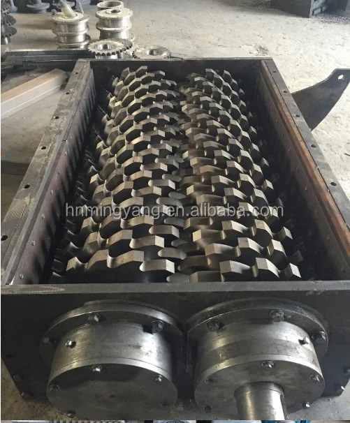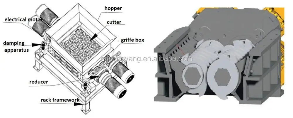 The material enters the shredding box by the feeding system. The chamber carries a shredding blade. The material is shredded into small pieces by a combination of tearing, squeezing, and shearing.