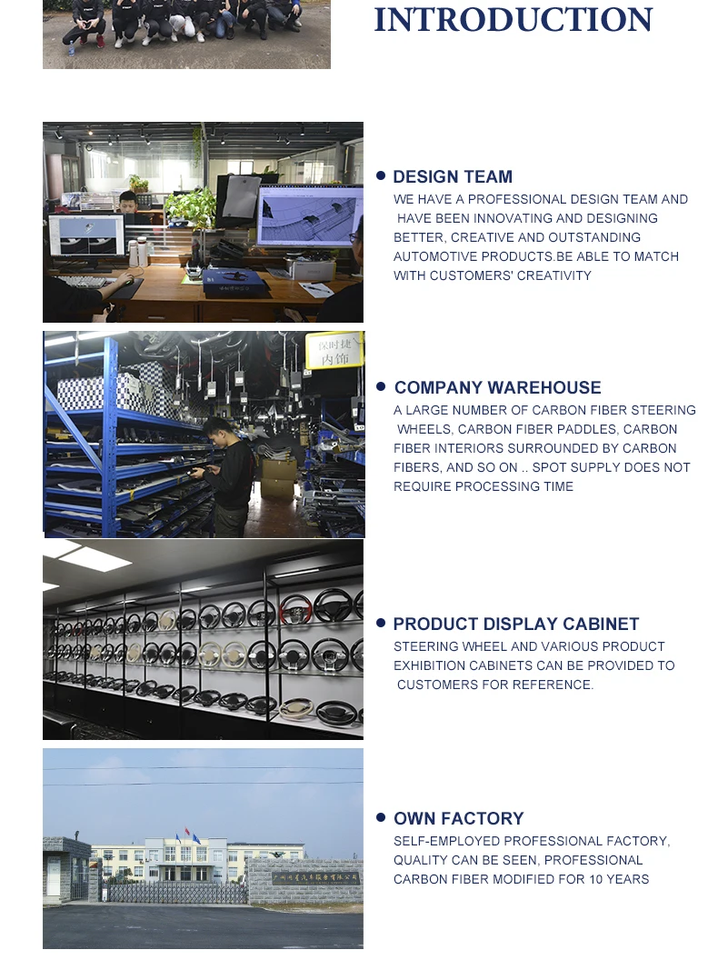 Company Description | Tongxing Auto Service Co., Ltd. was established in 2015. Before the company was established, the person in charge of the company had 10 years of experience in the manufacturing process of carbon fiber steering wheels. It was the first company to enter this industry in China. The company currently has 150 employees and 3000 All the processes of design, development and production of the square factory building are completed by our own company. At present, the company has the largest competitive core competence in China. The development of foaming process to replace the putty process can provide independent development and design services for customers! |