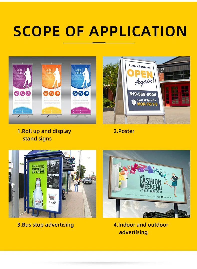 Application | Indoor and Outdoor Advertising, Poster , Roll up and display stand signs |