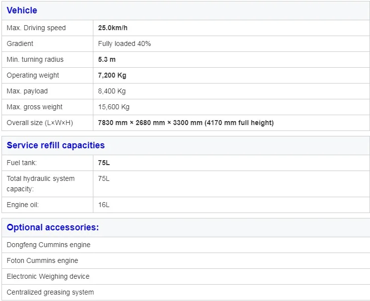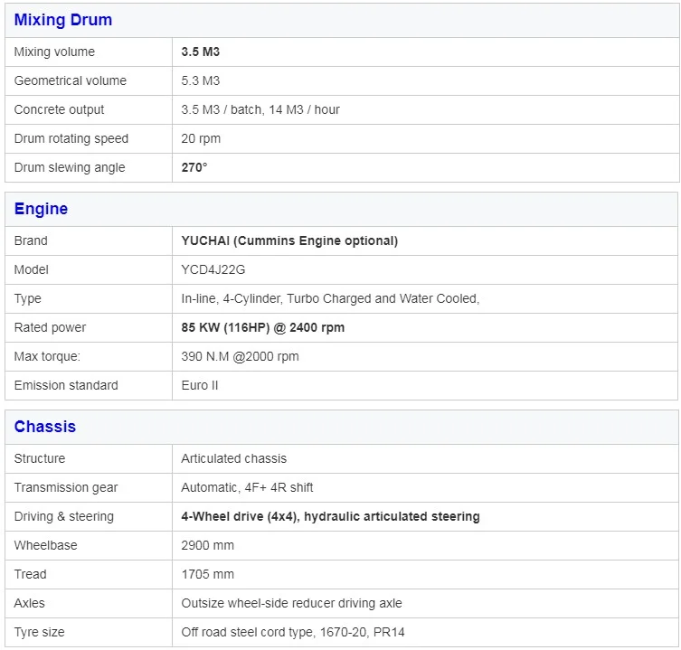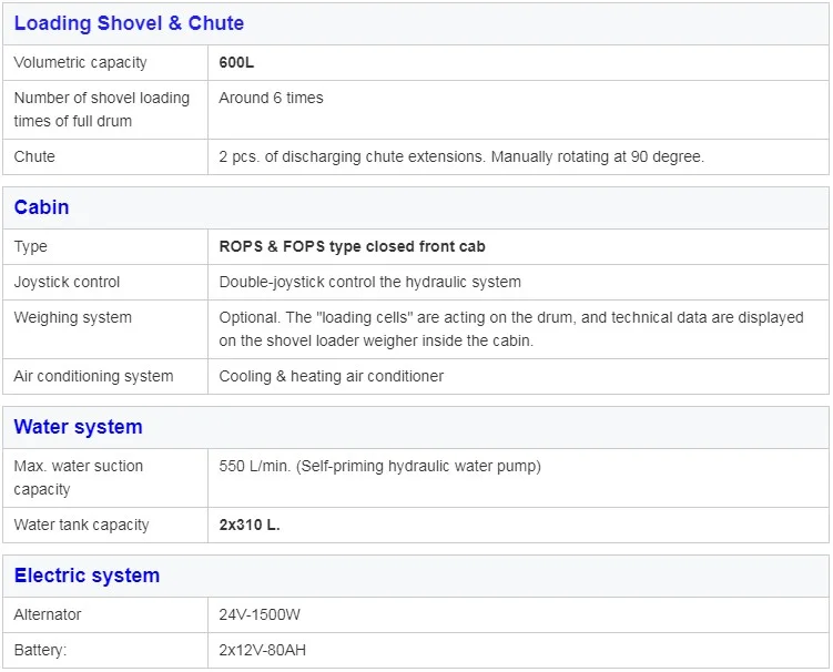 TECHNICAL PARAMETERS FOR SELF LOADING CONCRETE MIXER TRUCK | ||||||||||