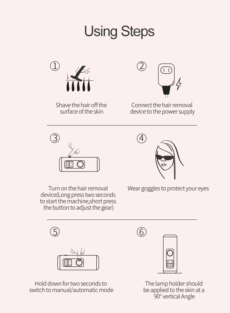 Advanced Technology | 1. Friendly to sensitive skin, safe clinically, no burns. 2. Safe & Painless & Efficient hair removal 3. Adjustable five energy levels 4. Auto Mode & Manual Mode 5. Leaves skin smooth and supple 6. Portable and Compact: Suit for home use or travel use. 7. Up to 999,999 Flashes | ||||||