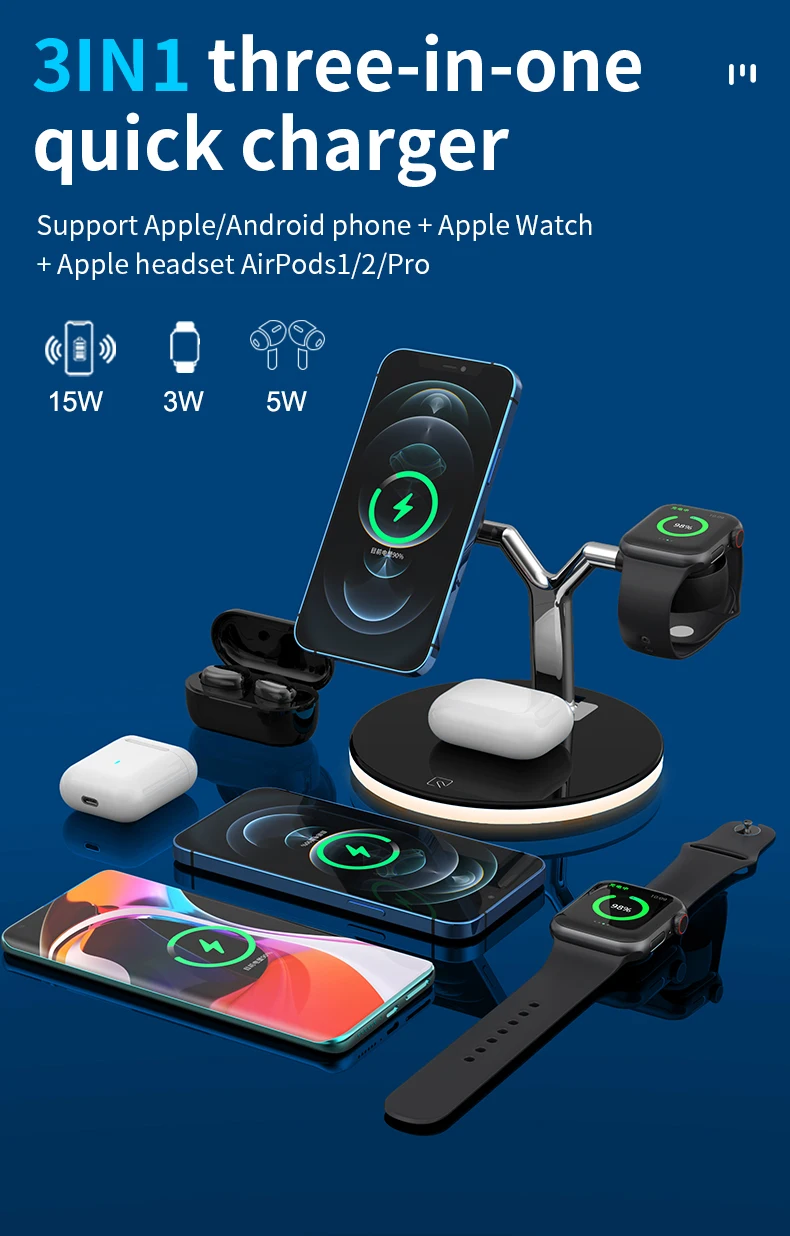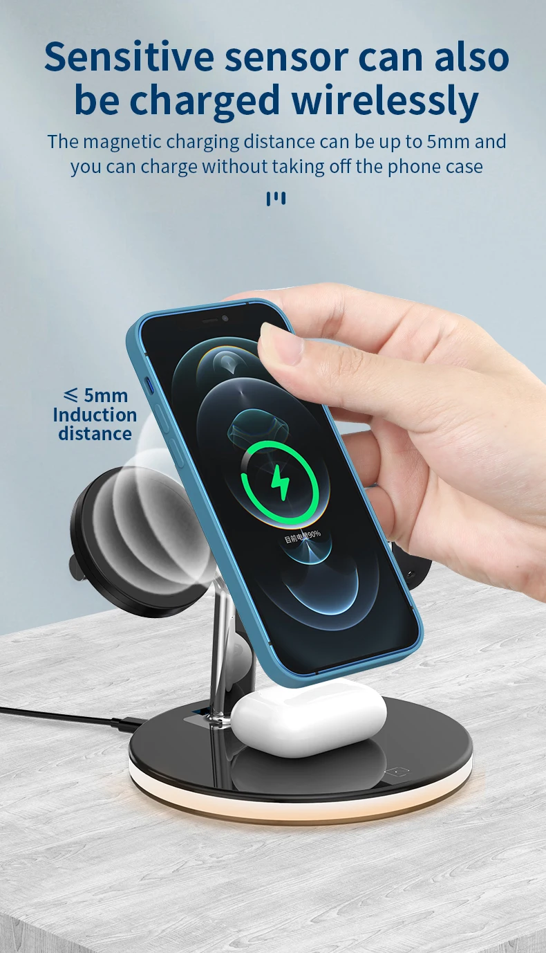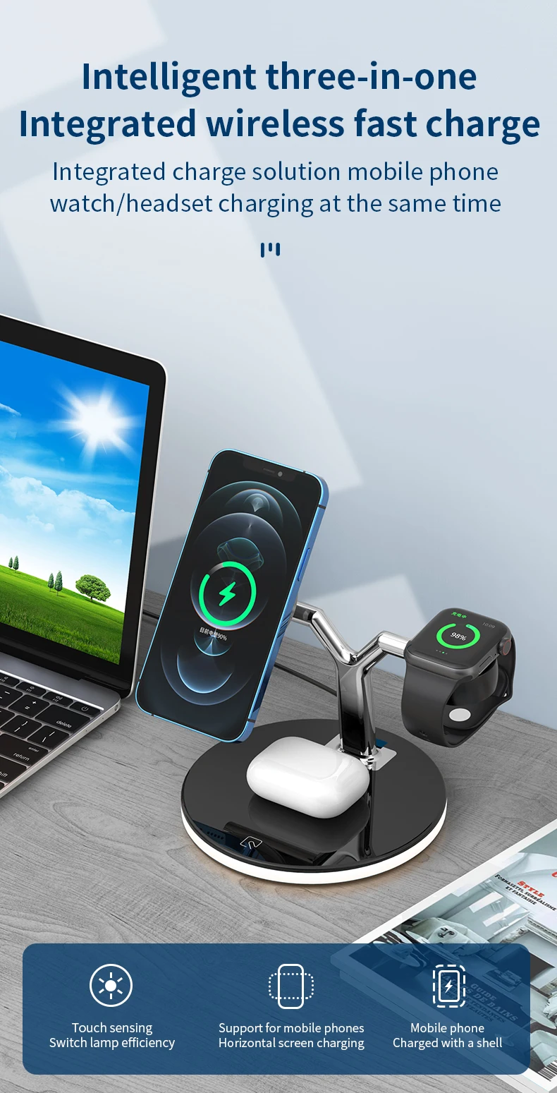 wireless table charger advantage | - Function: 25W max total while charging together1, magsafe phone charger 15W; 2, iWatch charger 3W; 3, AirPods charger 5W; 4, Qi phone charger 5W 5, USB extension port 10W; | ||||||