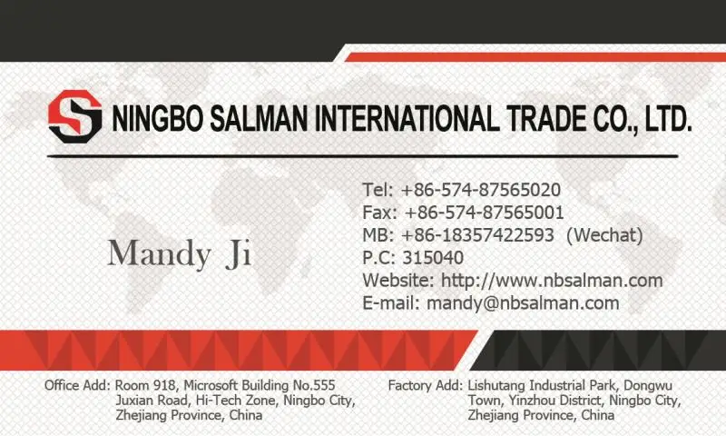Ningbo Salman International trade Co., Ltd. which registered capital is RMB 1880000 Yuan. It is the trade company and manufactory specializing in researching and developing products such as auto parts, machinery hydraumatic, off-road refits and outdoor rescue