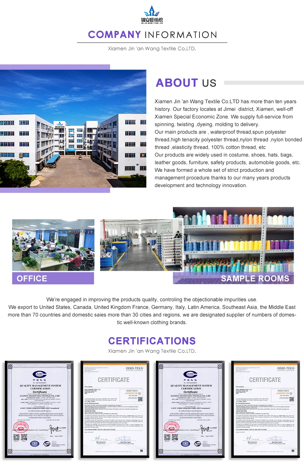 We are based in Fujian, China, start from 2020,sell to Domestic Market(30.00%),Southeast Asia(25.00%),Eastern Asia(10.00%),Africa(10.00%),Southern Europe(10.00%),South America(6.00%),North America(5.00%),South Asia(4.00%). There are total about 11-50 people in our office.
