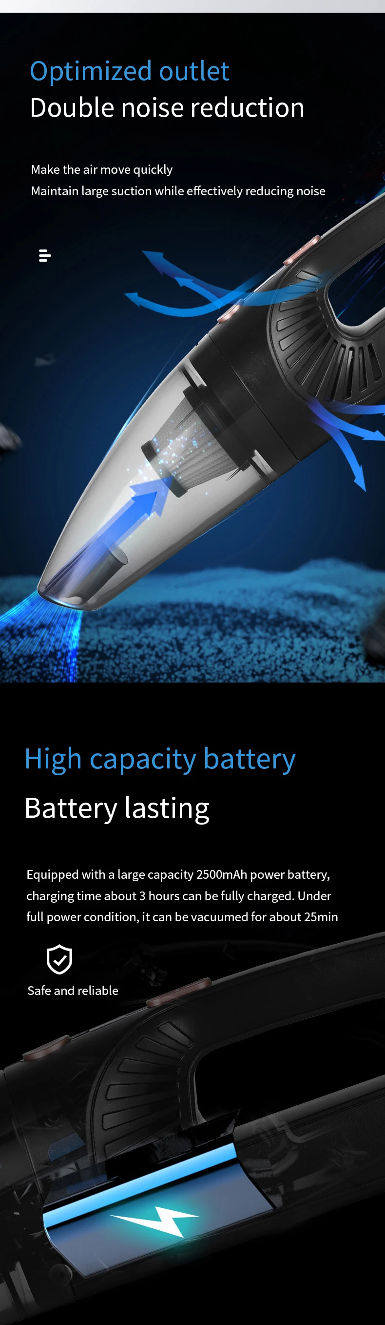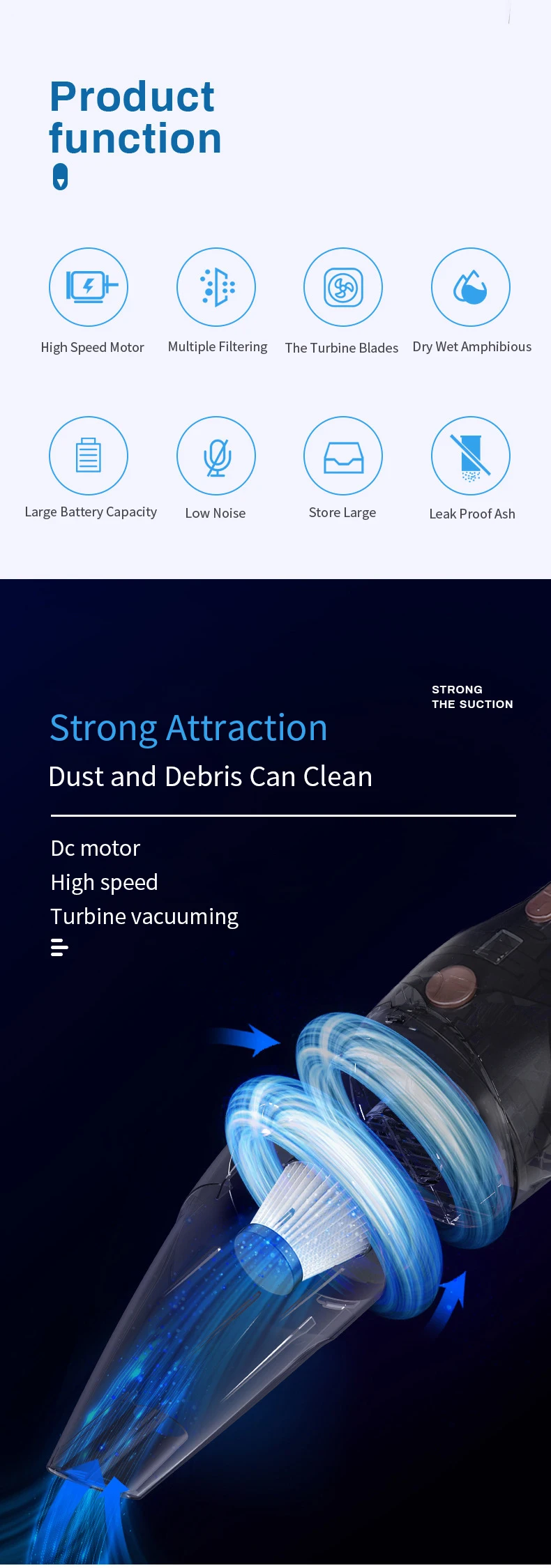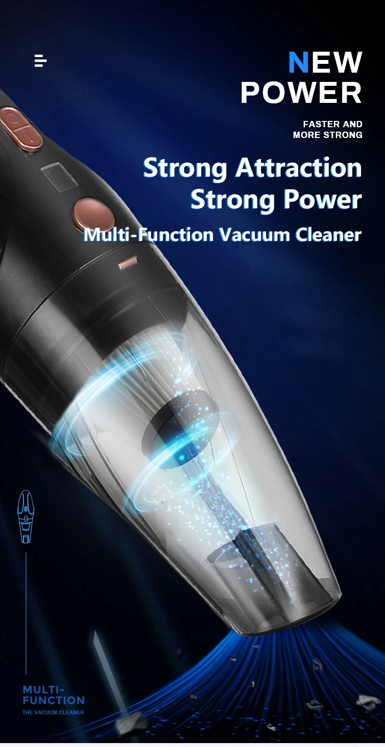 [Product features] All copper motor, vacuum degree, stable power, low noise, high power, aluminum blade, PET filter, increase dustproof baffle, color box with handle, packaging heat shrinkable film processing, cigarette end with fuse..
