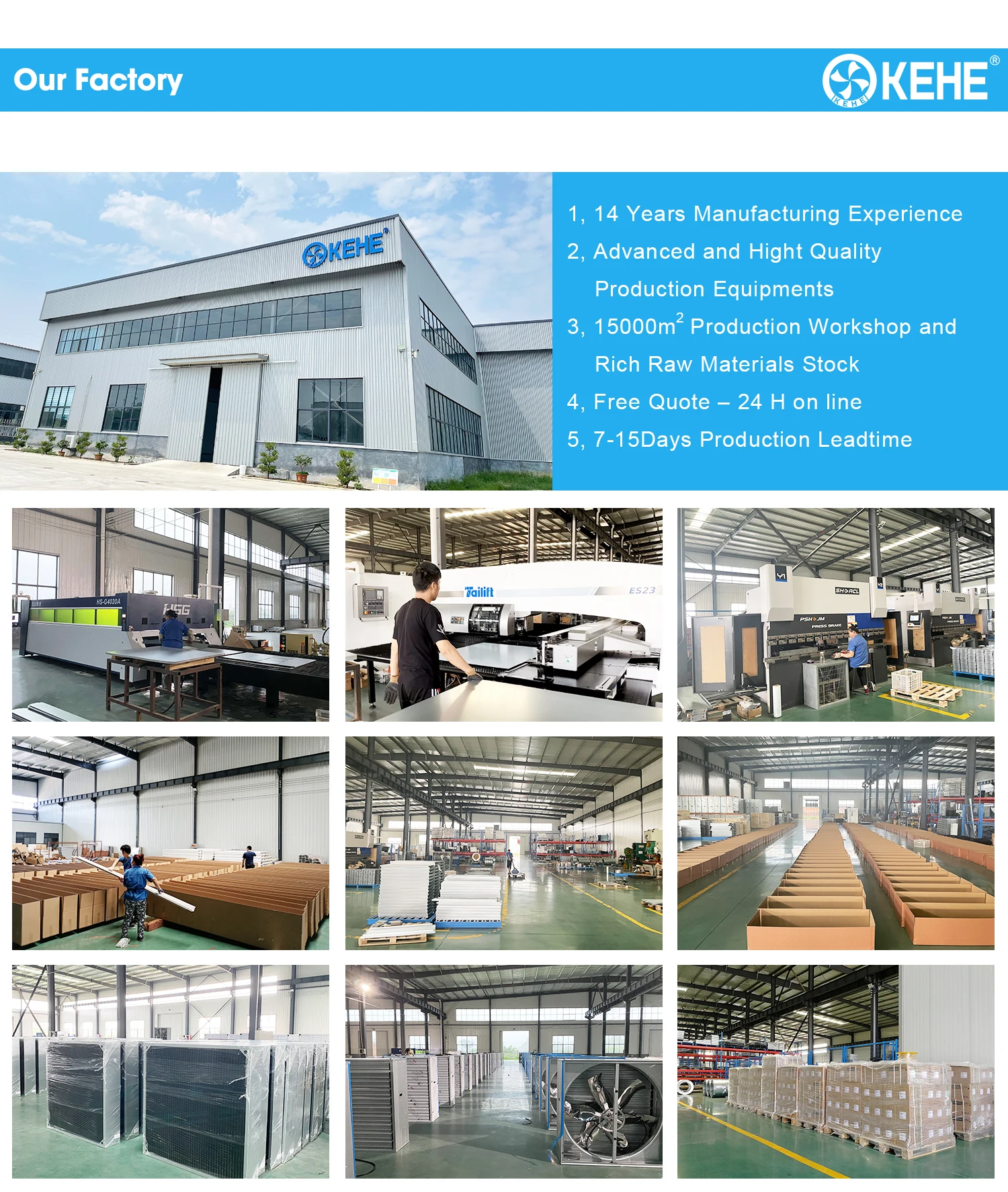 2. Kehe has advanced production technology with automatic equipment, professional production line, NC-based professional equipmen. Auto punching and bending, highly accurated. Frame material is made by 275g coating weight galvanized sheet.