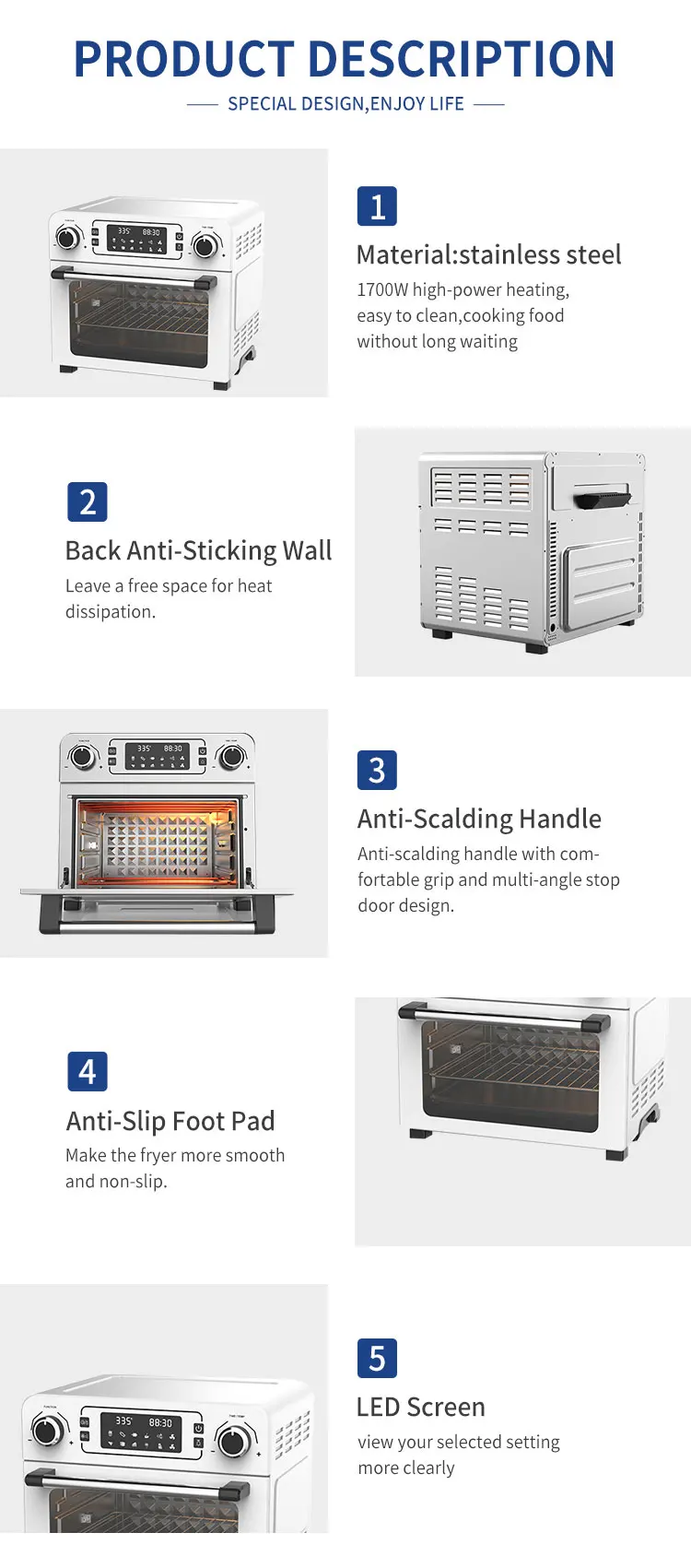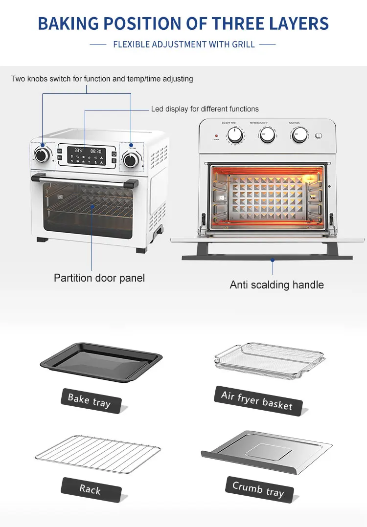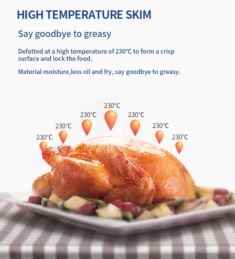 Function | Adjustable Thermostat Control, Detachable Oil Container, LCD Display, Non-Stick Cooking Surface, Overheat Protection, With Light Indicator, With Observation Window, stainless steel heating elements,Large capacity multi-layer design |