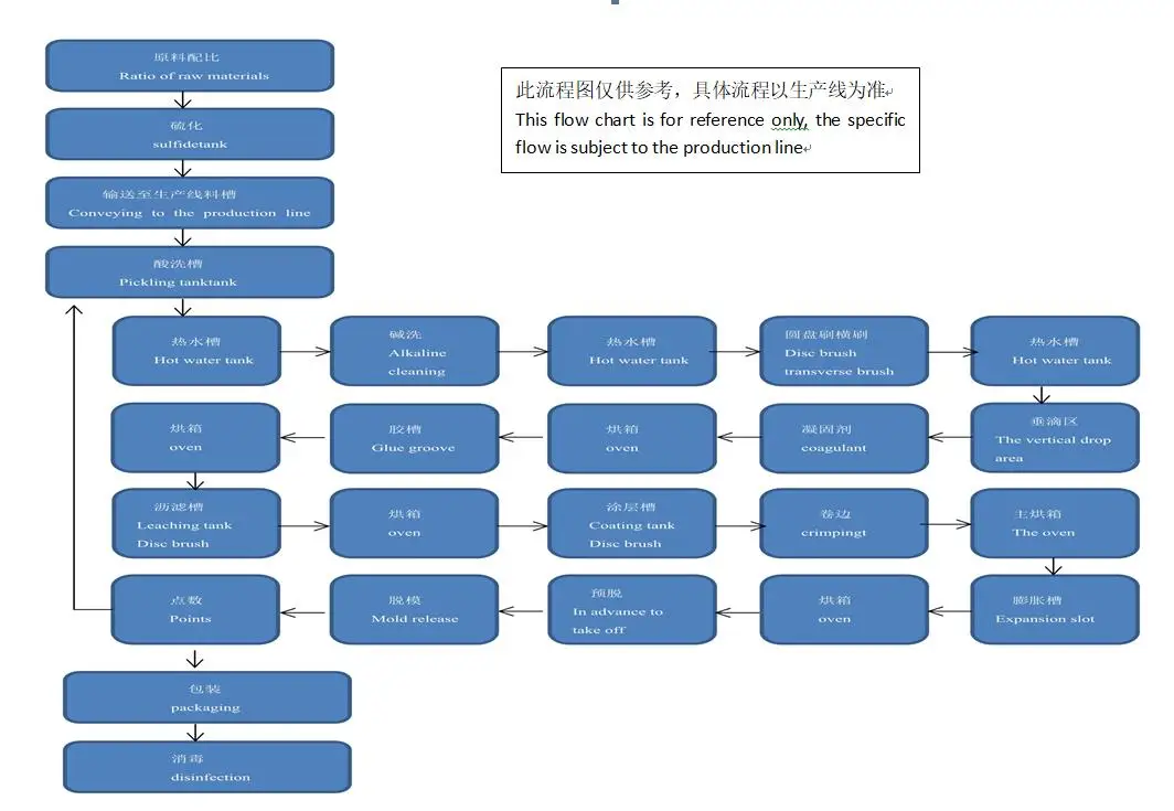 The nitrile/latex glove production line uses natural latex or synthetic rubber as the main raw material and other chemicals as auxiliary materials. The hand mold is cleaned with acid and alkali, and then cleaned with water again. Then the cleaned hand mold is first immersed in hot water and heated then immersed into coagulant and dried for dipping. After dipping, go into an oven for preliminary drying, flushed with hot water and then sent to another oven for curing and drying to form. After the gloves are demolded, they are inflated or filled with water for inspection, washed.centrifuged. and dried before packaging and sending them to the finished product warehouse.