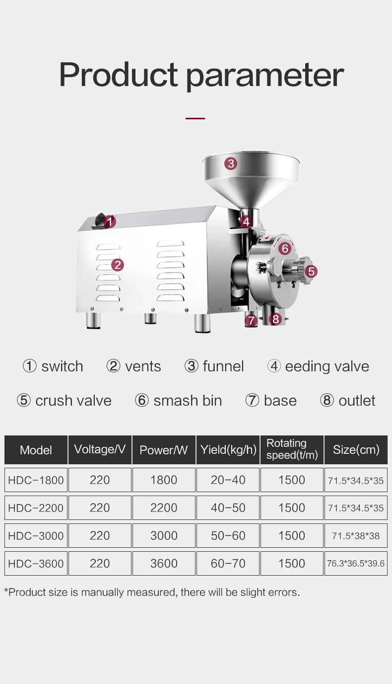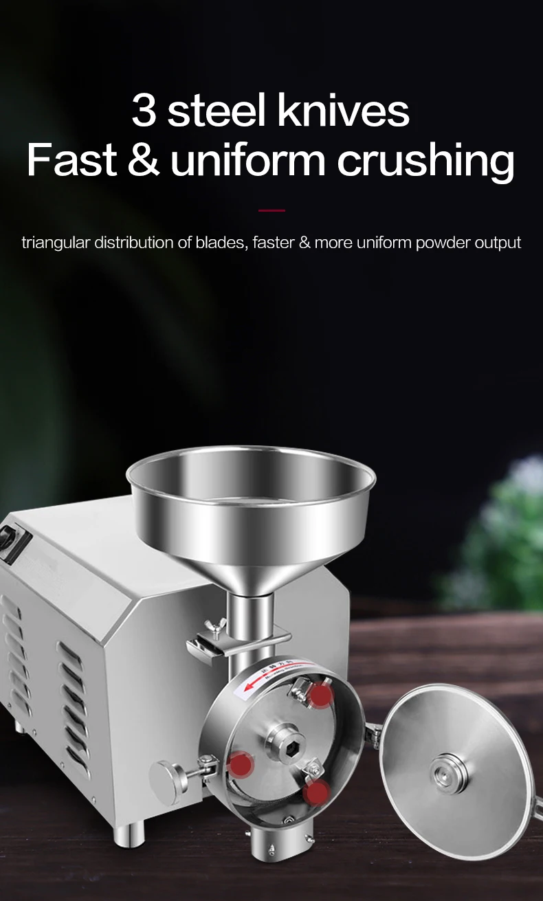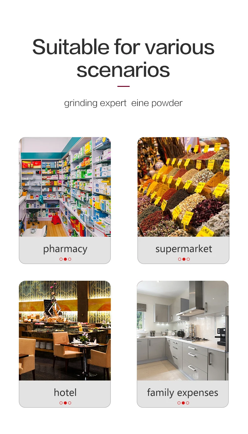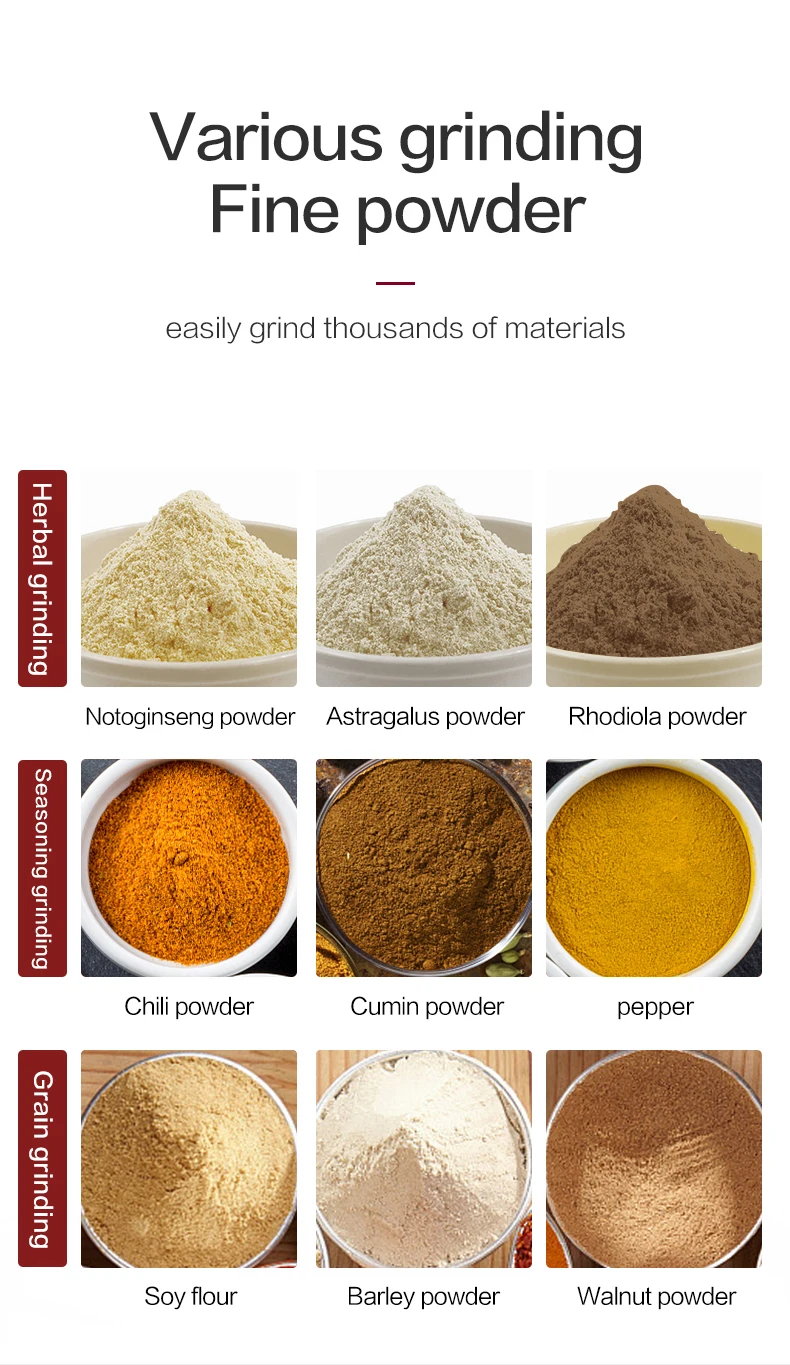 This grinder is popular in homes, drugstores, food processing plants and SPA shops.It is widely used in pharmaceutical, food,chemical industry materials crushed.