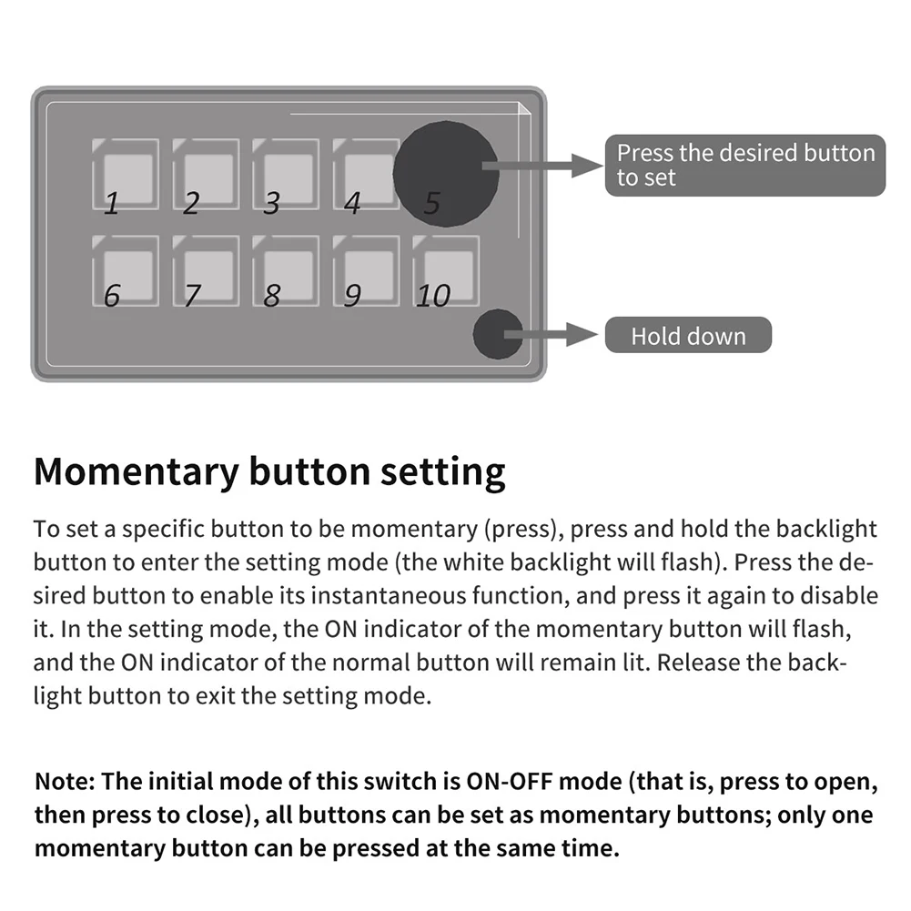 7. Programmable momentary buttons-all buttons can be programmed as reset buttons (the reset function is usually suitable for horn or wiper applications)