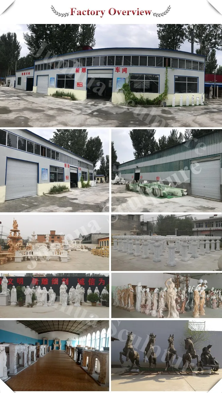 Quyang Junhua Sculpture in one of biggest factory to produce all kinds of stone,bronze,stainless steel sculptures in QuYang which is known sculptures in the World.We are the direct factory with more than 30 years produce experiences which can offer water fountain,figure statues,fireplace mantel,animal statue,gazebo,flowerpot,lights,tombstone..., Professional design team and produce team,we can offer high quality products.