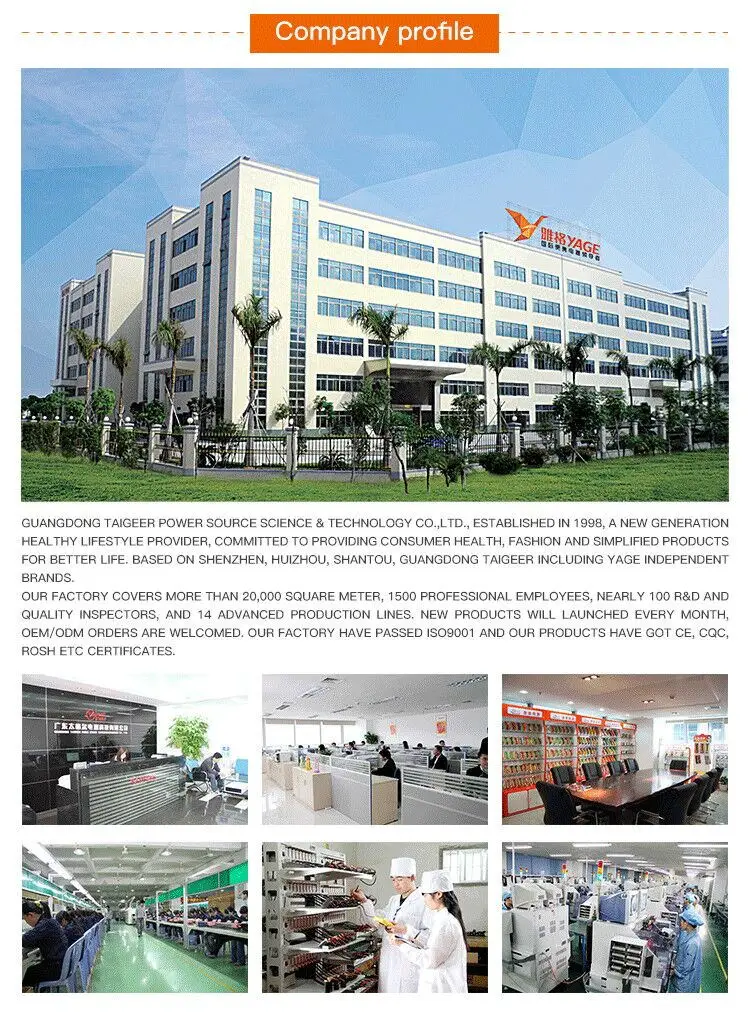 Guangdong Taigeer Power Source Science & Technology Co.,Ltd., established in 1998, a new generation healthy lifestyle provider, committed to providing consumer health, fashion and simplified products for better life. Based on Shenzhen, Huizhou, Shantou, Guangdong Taigeer including YAGE, NSBAO independent brands. Of band YAGE with rich popularized product lines such as Mosquito control products, Soft cloud light desk lamp, Led head lamp, Led camping lamp, and so on. YAGE have 20,000 square meter factory area, 1500 professional employees, nearly 100 R&D and quality inspectors, and 14 advanced production lines. New products will launched every month, OEM/ODM orders are welcomed.