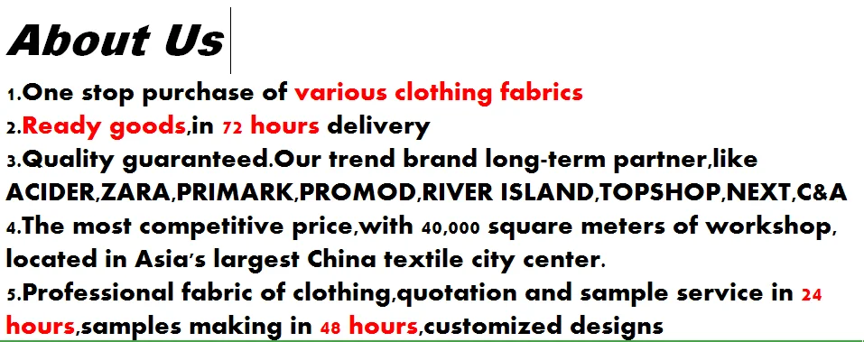 A: Knitted fabrics like jacquard, loose knitting, other basic knitting , lady fabric like lace ,emb ,mesh and process fabric ,etc.
