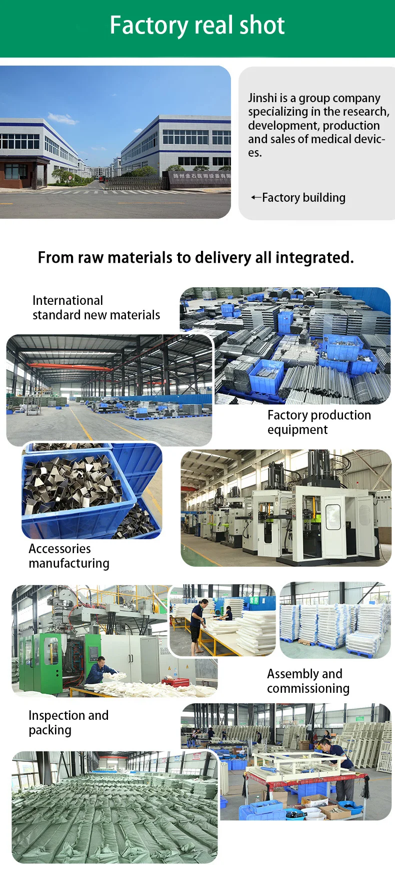 YANGZHOU JINSHI MEDICAL EQUIPMENT CO.,LTD is a professional hospital furniture manufacture, loated in Yangzhou City, 2 hours from Shanghai. Mainly products are hospital beds,hospital trolley, patient stretcher, bedside lockers, operation table etc, With Well-equipped facilities and strong engineering team, skilled workers and professional sale team ensure high quality products, plusing reasonable price, and Timely And Thoughtful Service, our products are widely recognized and extensively used in hospital projects and other hospital industries in china and abroad.We sincerely welcome new and old customers to contact and visit us for future business relationships and achieving mutual success!