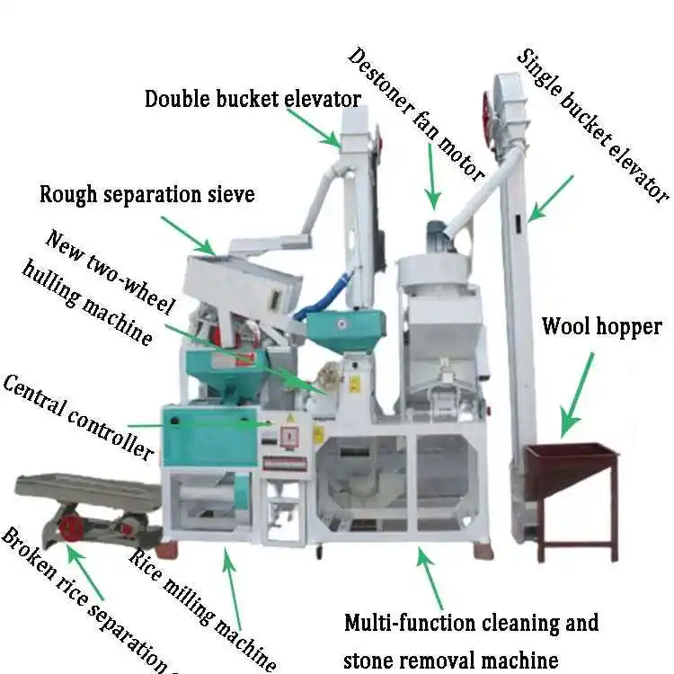 Whole set combined rice mill main lincludes: 45a stone cleaning machine, MLGJ15 husker, MGCZ70×5 Gravity Paddy Separator, MNMF15 High-power Suction Type emery-roller Rice Mill.The produce can cleaner, destoner, huller, paddy separator, whitener( polisher) , grader all in one.