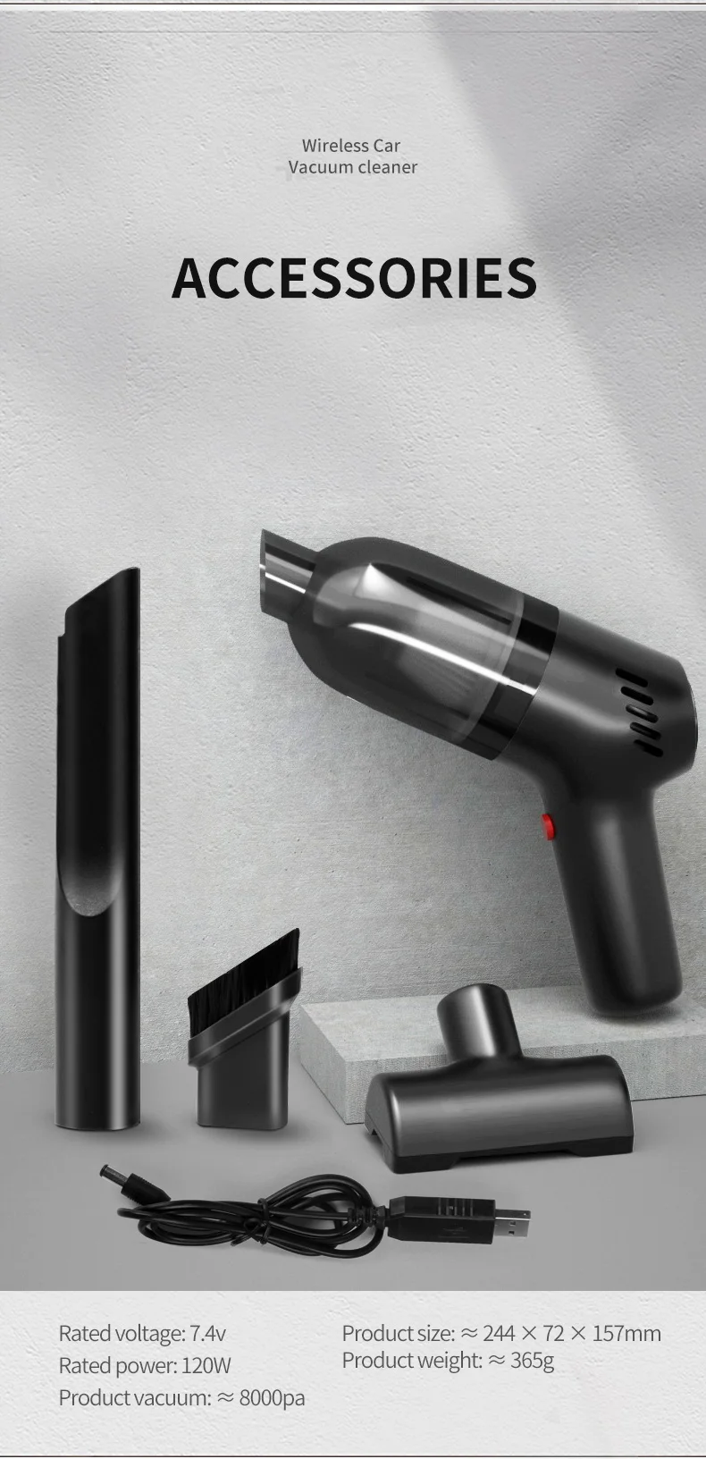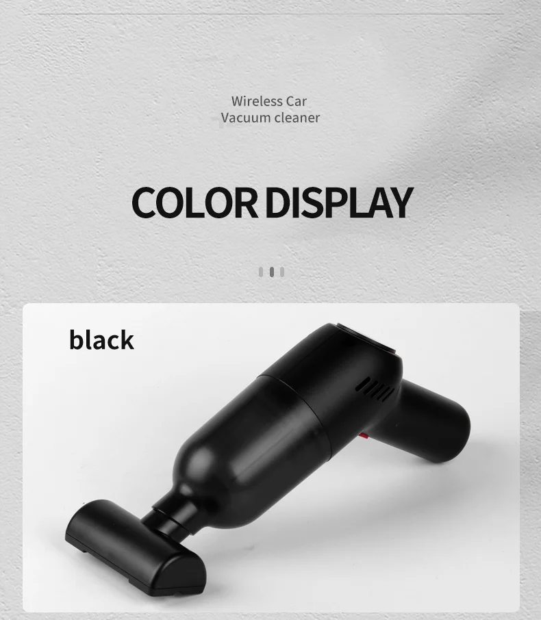 FEATURE | 1. SMALL SIZE AND LIGHT WEIGHT 2. LONG STANDBY FOR 30 DAYS 3. DOUBLE FILTRATION TO PREVENT SECONDARY POLLUTION 4. BRUSHLESS MOTOR WITH LOW NOISE 5. MULTIFUNCTIONAL SUCTION PORT 6. IT IS SUITABLE FOR MANY SCENES SUCH AS HOME, CAR, OFFICE, ETC. 7. IT IS SUITABLE FOR CLEAR CAR SEATS, PET HAIR, SMALL DUST, ETC. |