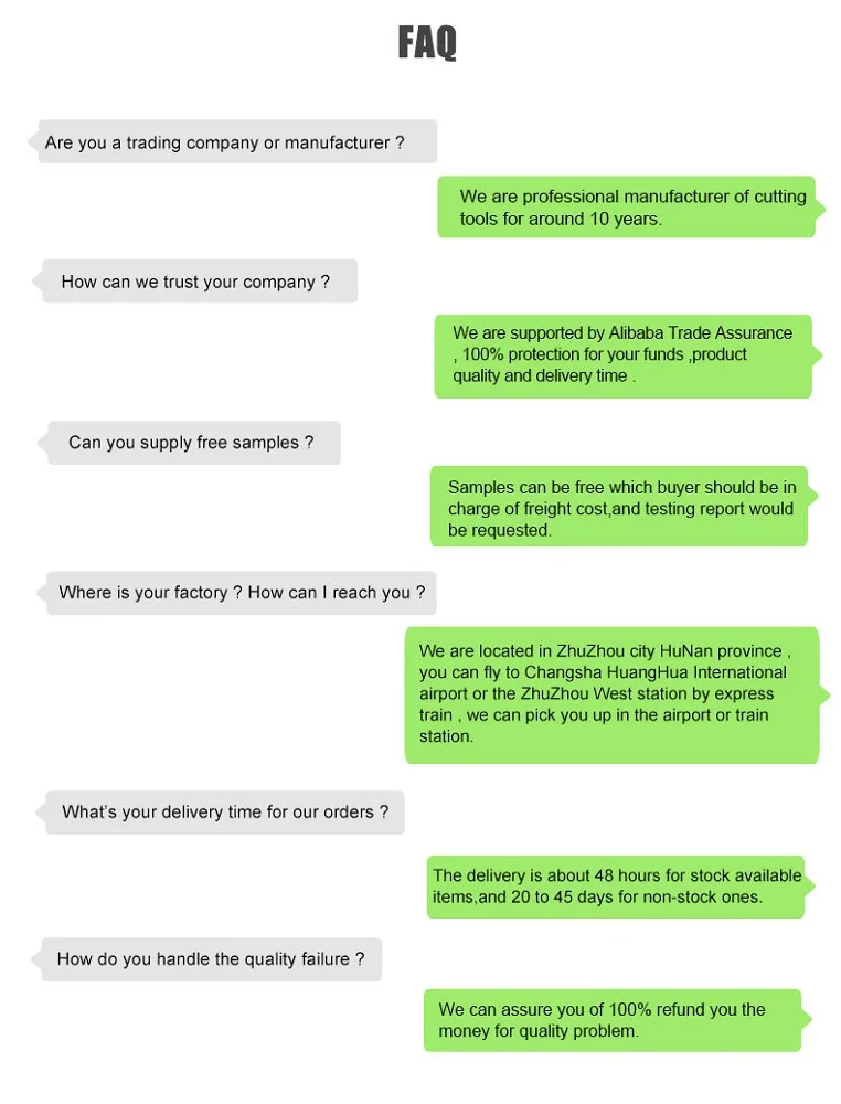 TNMG1604 CNC C Are you a trading company or manufacturer ? We are professional manufacturer of cutting tools for around 10 years. How can we trust your company ? We are supported by Alibaba Trade Assurance , 100% protection for your funds ,product quality and delivery time . Can you supply free samples ? Samples can be free which buyer should be in charge of freight cost,and testing report would be requested. Where is your factory ? How can I reach you ? We are located in ZhuZhou city HuNan province , you can fly to Changsha HuangHua International airport or the ZhuZhou West station by express train , we can pick you up in the airport or train station. What’s your delivery time for our orders ? The delivery is about 48 hours for stock available items,and 20 to 45 days for non-stock ones. How do you handle the quality failure ? We can assure you of 100% refund you the money for quality problem.arbide Lathe Cutting Tools Inserts Hard Alloy Plate Blades for Steel Machining