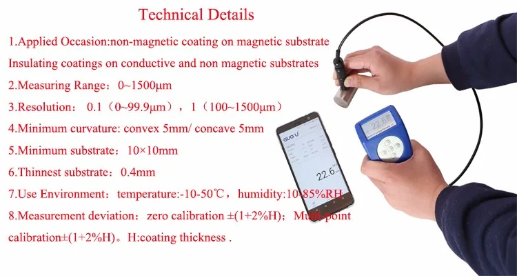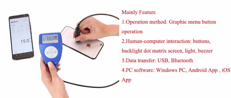 The instrument uses magnetic and eddy current two thickness measurement methods, can be measured without loss of magnetic metal matrix (such as steel, iron, alloy and hard magnetic steel, etc.) on the thickness of non-magnetic coating (such as aluminum, chromium, copper, enamel, Rubber, paint, etc.) and non-magnetic metal substrate (such as copper, aluminum, zinc, tin, etc.) on the thickness of non-conductive coating (such as: enamel, rubber, paint, plastic, etc.).