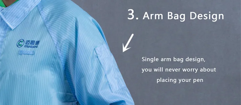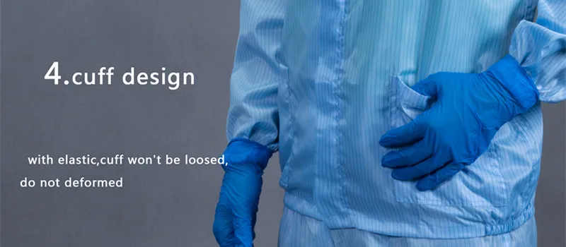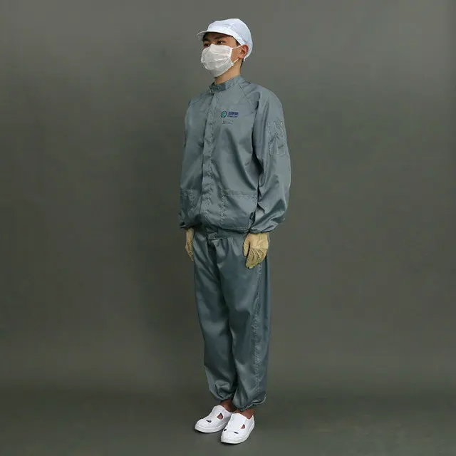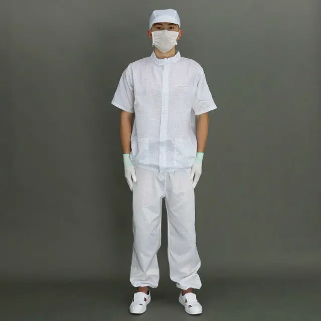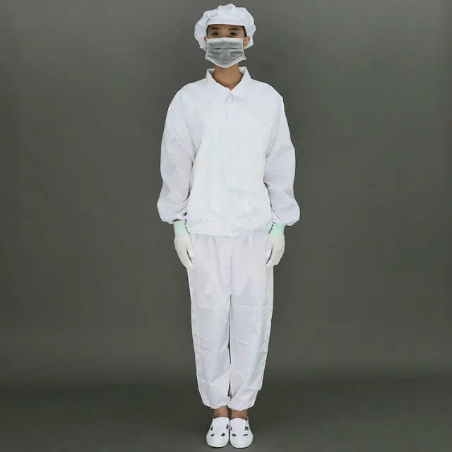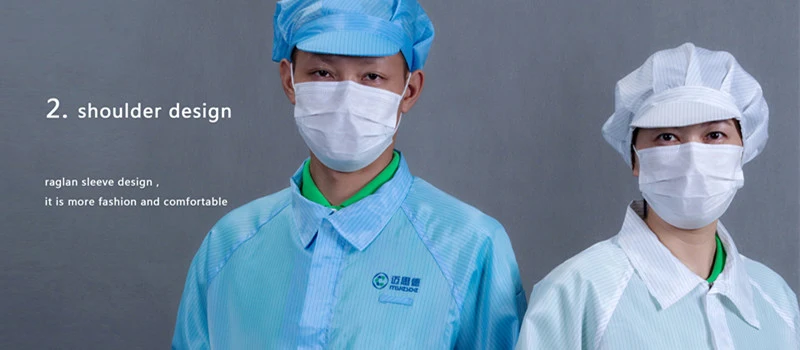 Features | 1. Applied to both men and women, weaved by polyester filament fiber and imported conductive fiber. 2. Effectively removing the static electricity of the body, with a permanent antistatic property. 3. Comfortable and washing-resistant. 4. Scope: static sensitive areas and general cleaning area. 5. Many choices of fabrics and colors of 5mm strips, 5mm grid and 2.5mm grid. 6. Cleanliness, filtration,comfortable 7. Durable and easy-dressing | |