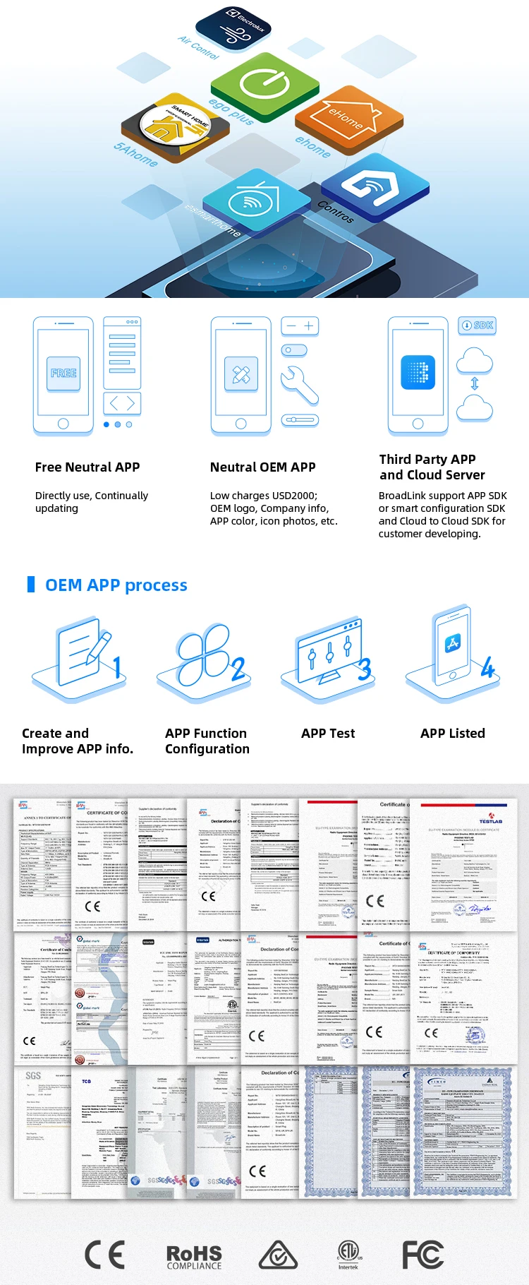 Умные устройства BroadLink имеют сертификаты CE, ROHS, FCC, ETL, RCM и т. д. Клиенты могут напрямую получить собственную сертификацию, которая была передана сертификатами BroadLink. Это дешевле и быстрее.