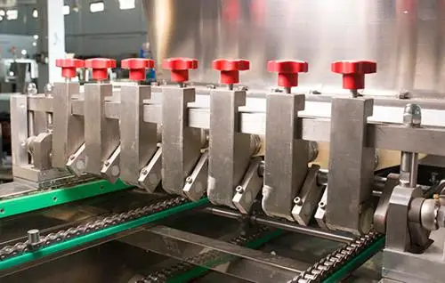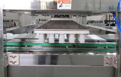 d- After cream/chocolate/jam filling, the trays enter the depanning section. Madeleine Cakes will be taken out from trays in one time accurately and completely, then the cakes are conveyed into the UV line for sterilization, while the empty trays move to oil sprayer for another circular production.