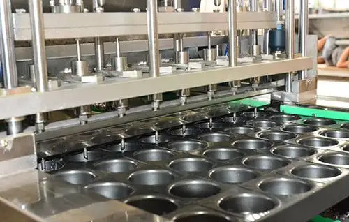 b- Then accurately fills a certain amount of paste into the moulds. Labor send the moulds to the rotary oven.
