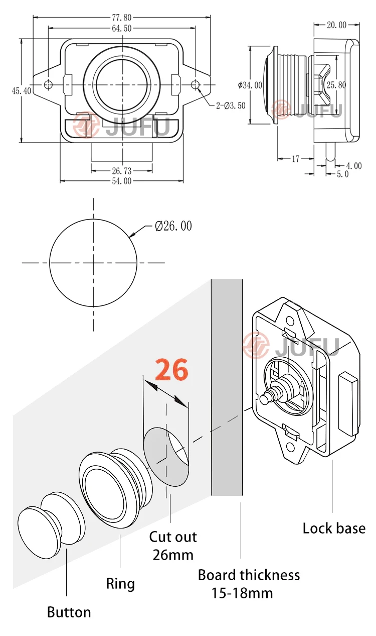 2. Cut Hole Diameter: 26mm, fit for 15-18mm thickness doors and drawers. Easy to install, flexible switch, exquisite appearance, packing with screws and L shape striking plate.
