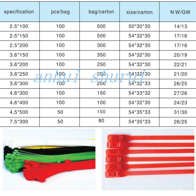 There are cable ties sizes 2.5*100,2.5*150,2.5*200,3.6*150,3.6*200,3.6*250,3.6*300,4.6*300,4.6*400,4.5*500, 7.5*300. As for the choice of color, as shown in the figure, we have white, black, green, blue, red, yellow and so on. We also welcome you to customize the color.