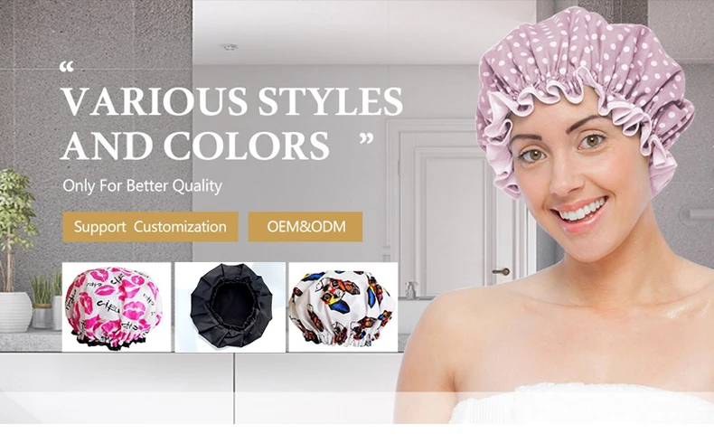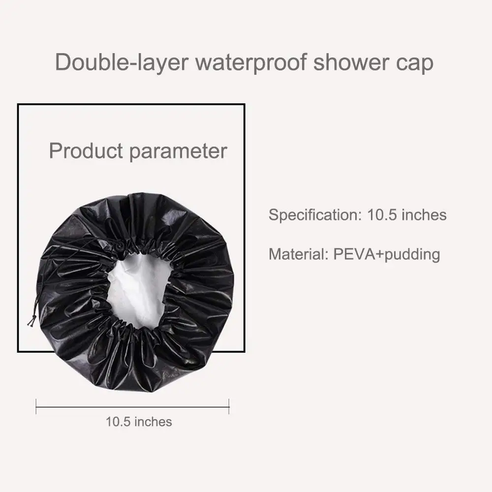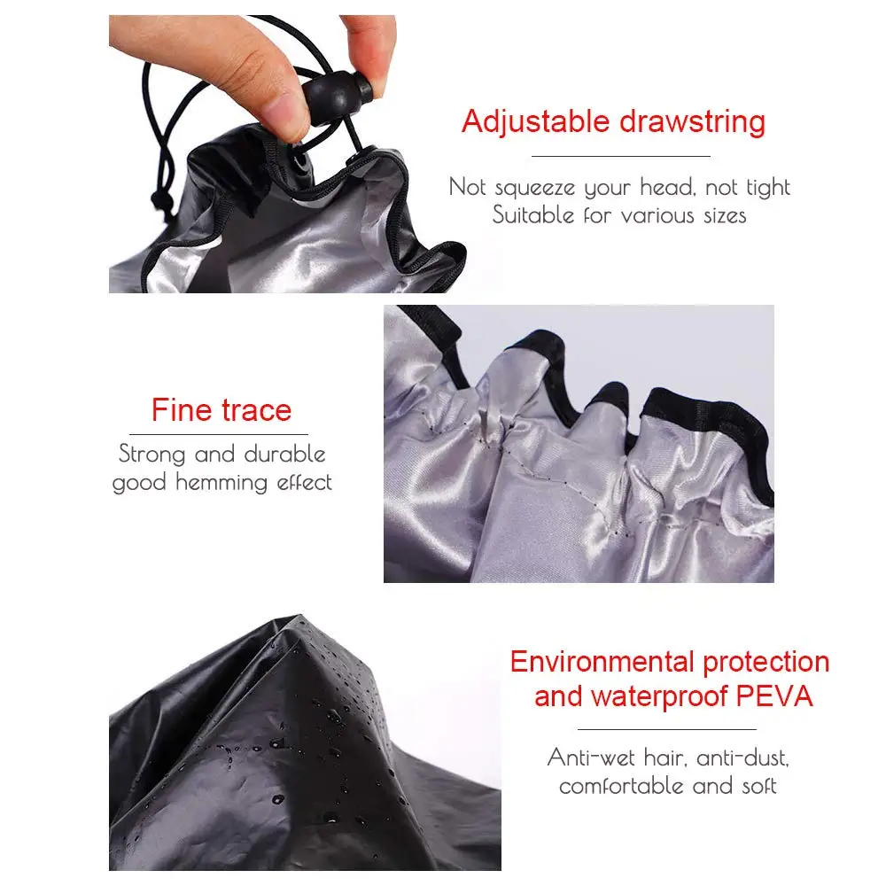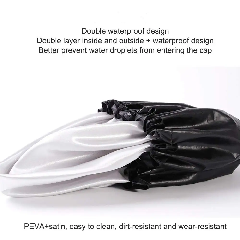DOUBLE LAYER WATERPROOF Made from a polyesterr and EVA iwhich effectively keeps your hair dry when you enjoy a shower. Please wear the shower cap in the correct way to avoid wetting your hair.