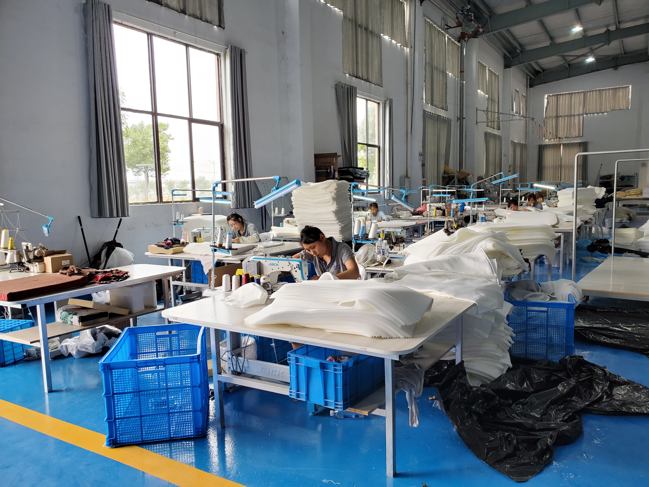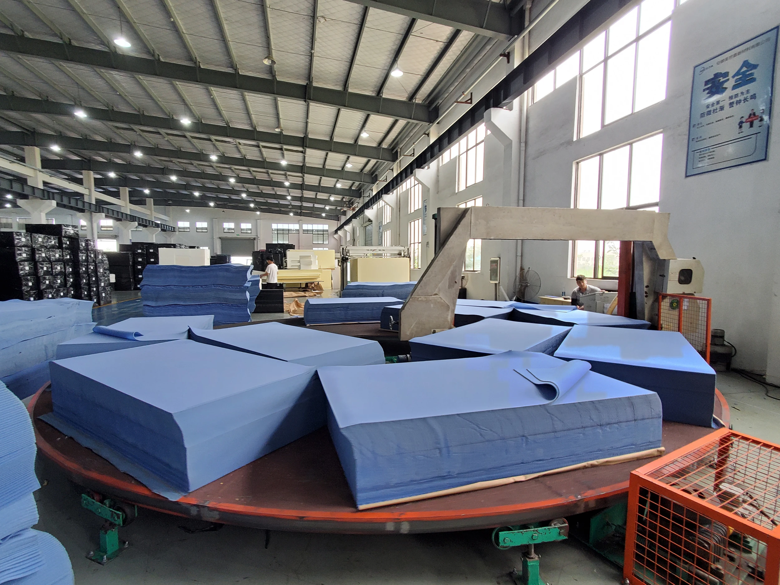 We mainly produce polyurethane foaming plastic, which is also called the foam product. Most of them are automotive interior trimming foam, underwear foam, home furnishing foam. The high pressure foaming line which was imported from Germany Hennecke is the most advanced flexible foam foaming equipment in this world. The product quality is stable and eco friendly, energy-saving, and pollution-free. We also have a circular cutting machine which was imported from Germany BMW and four high-precision rail cutting machines, a number of CNC cutting machines and processing equipment. All these equipment make the production fully mechanized.