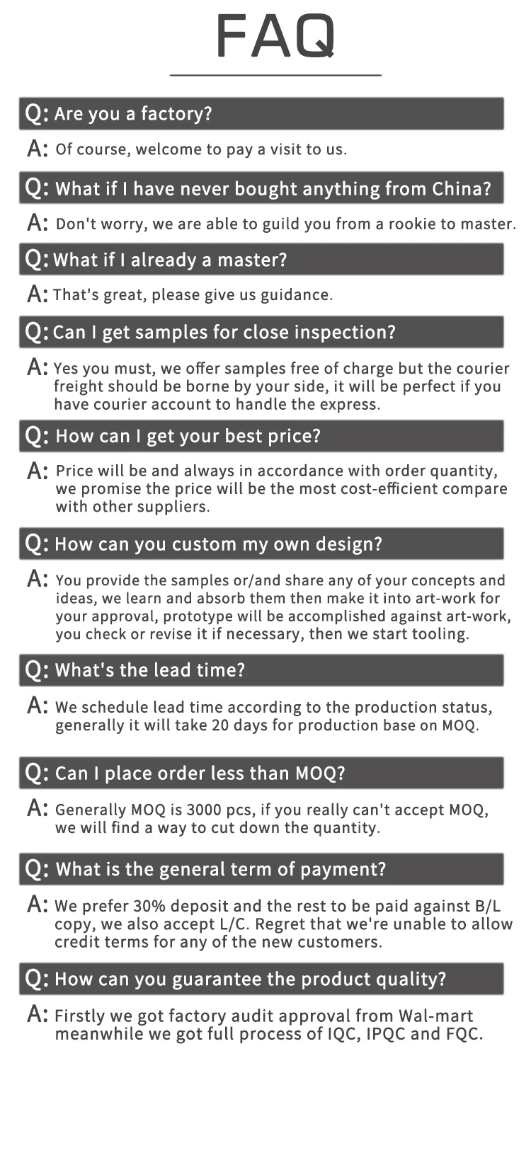 Sample | We can express out in 2 days if there is current sample and got freight collect account. Customized sample is around 5-7 days | ||||