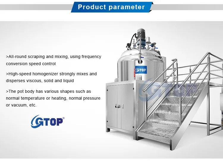 3. Stainless Steel Mixing Tank has mixing agitator,bottom homogenizer,stainless steel jacket tank shell,motor,electric control box,operation platform,staircase,etc.