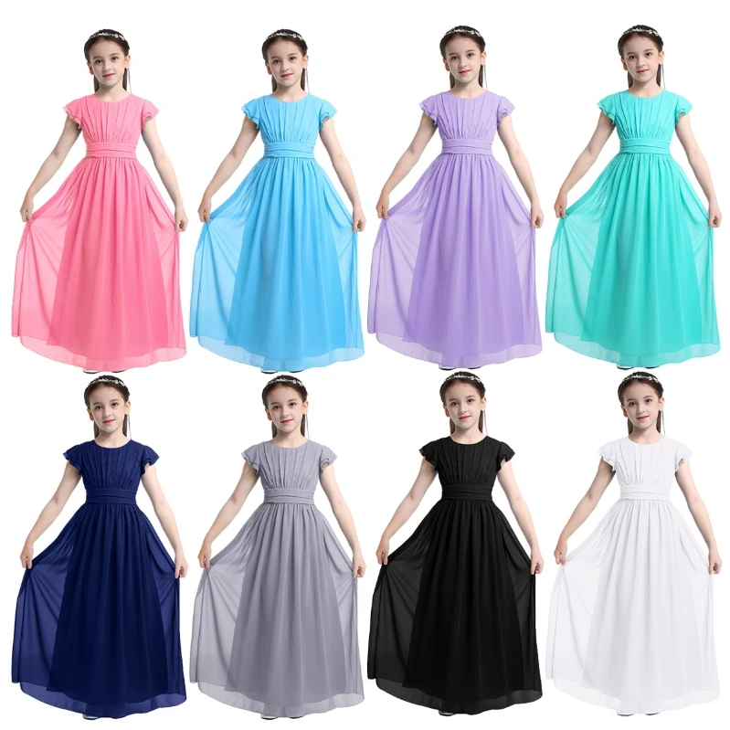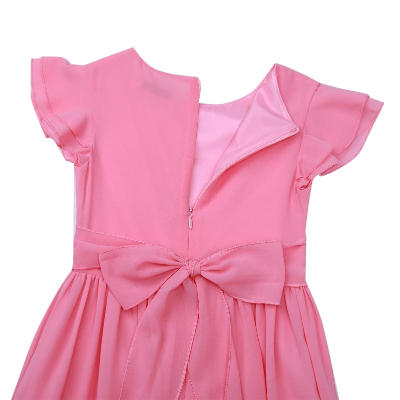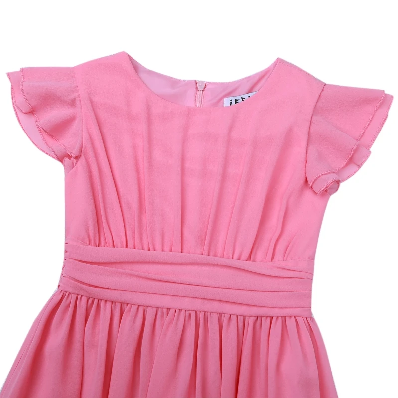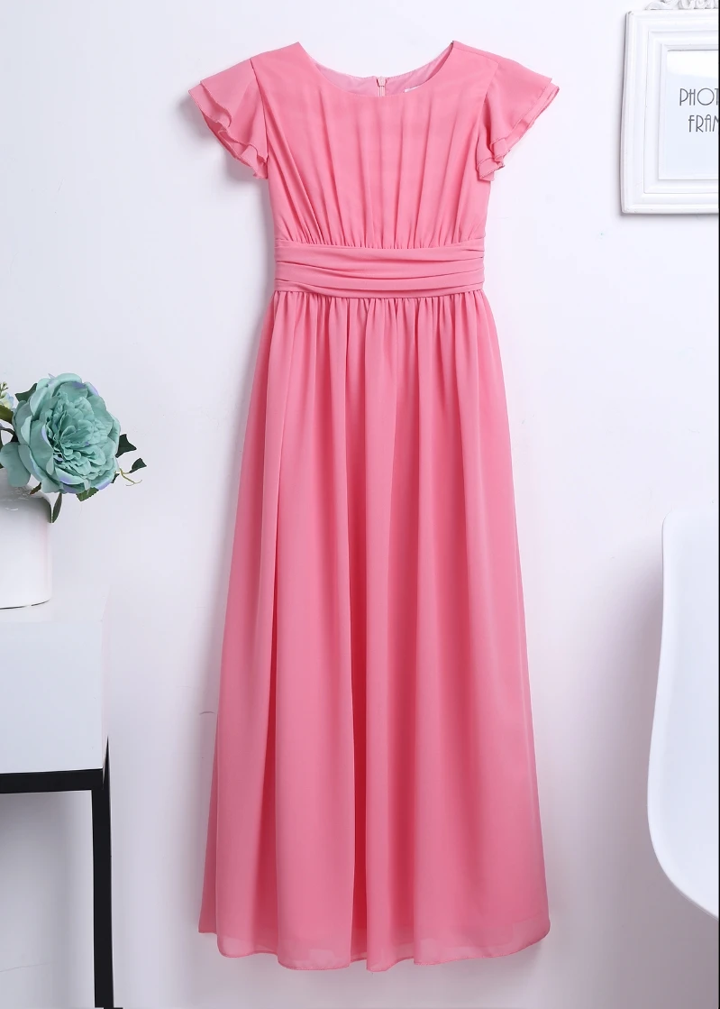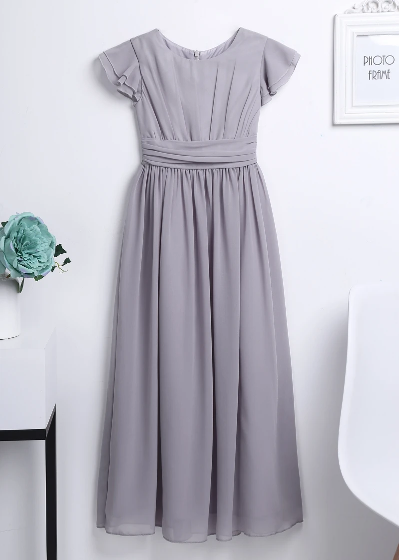 Round neck, flutter sleeves, ruched top bodice, pleated high-waisted design, sash ties at the back, hidden back zipper closure.
