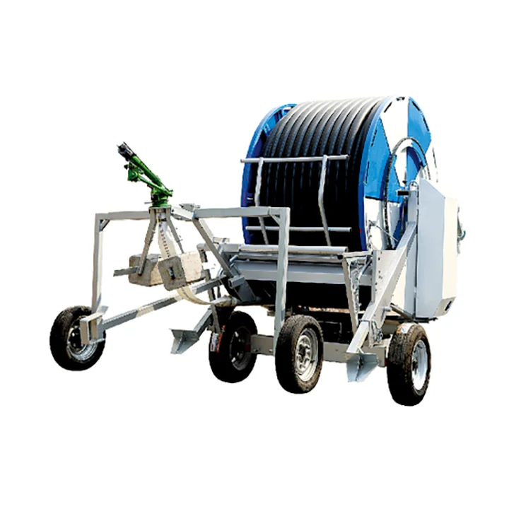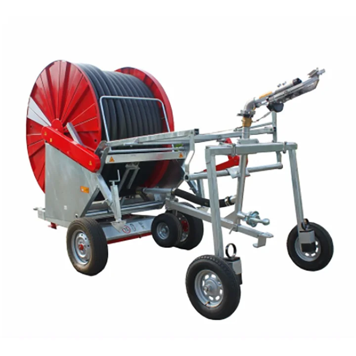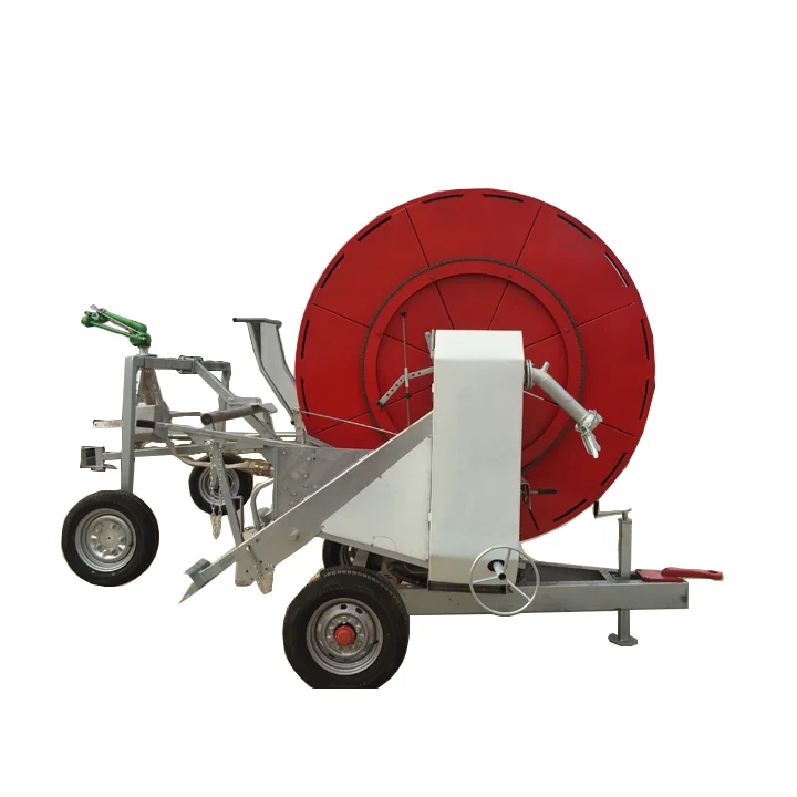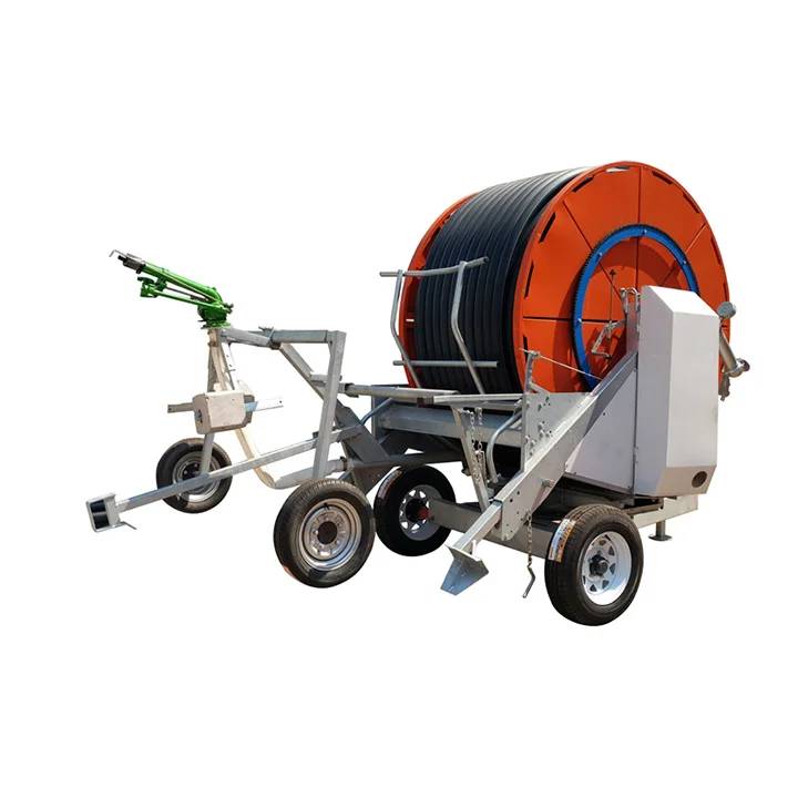 The hose reel irrigation machine is composed of frame ,reel,PE tube,water turbine,gearbox and water carriage.Spray gun is mounted on a trolley which is dragged by the hose driven by water turbine.So the machine actually is motivated by the water pressure.