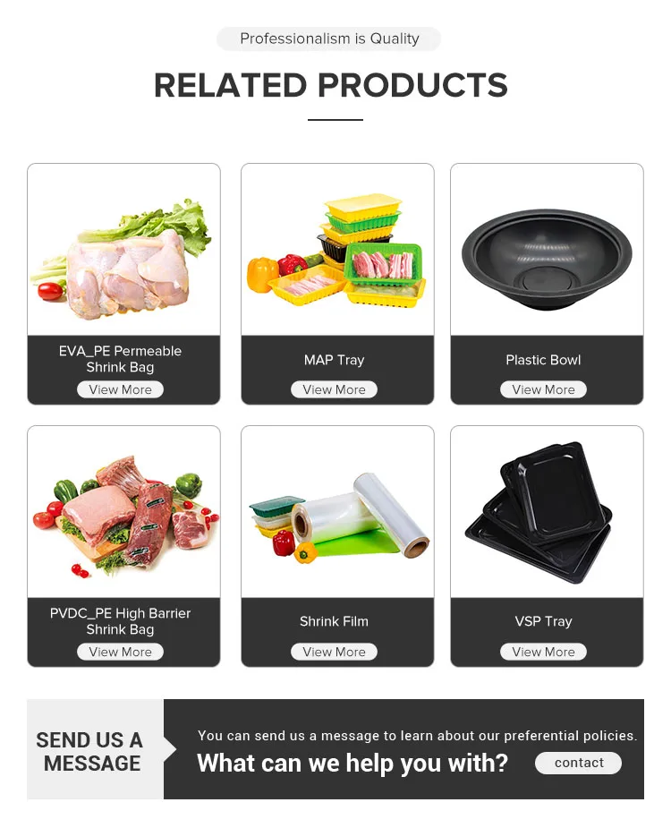 A: We mainly produce EVOH high barrier shrink film and bags, vacuum shrink film and bags, MAP Tray, VSP Tray, disposable plastic cup and bowl.