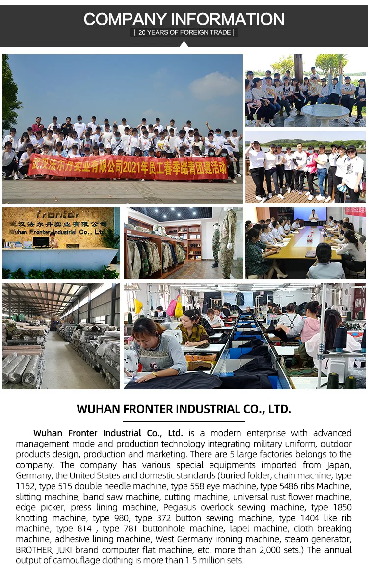 Q1: Are you manufacturer? A: Yes, we are a company which major in producing kinds of military uniforms and outdoor camouflage clothing.