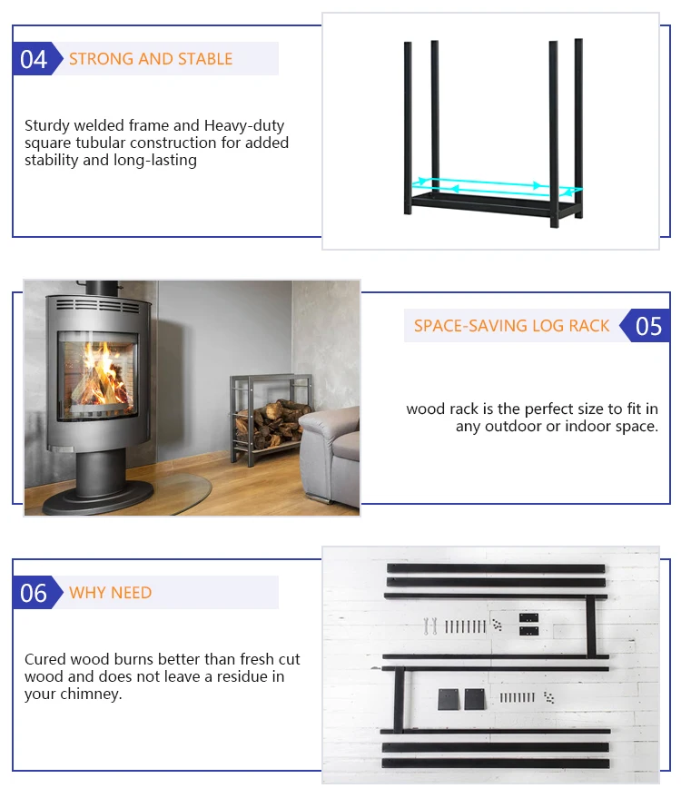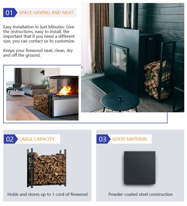 Features:1. Holds and stores up to 1 cord of firewood2. Powder-coated steel construction3. Sturdy welded frame and Heavy-duty square tubular construction for added stability and long-lasting4. Easy Installation in Just Minutes: Give the instructions, easy to install, the important that if you need a different size, you can contact us to customize. 5. Keeps your firewood neat, clean, dry and off the ground