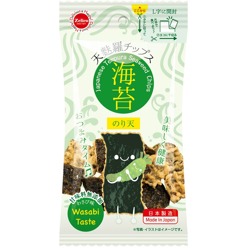 Ingredient | Wheat flour, Vegetable oil, Dried laver, Starch, Sugar, Salt, Wasabi seasoning, Squid, Albumen, Sea lettuce, Yeast extract/Swasoning(Amino acids,ect.) Flavor, Antioxidants(V.C), Spice extract, (Including gluten, egg, squid, soybean) |