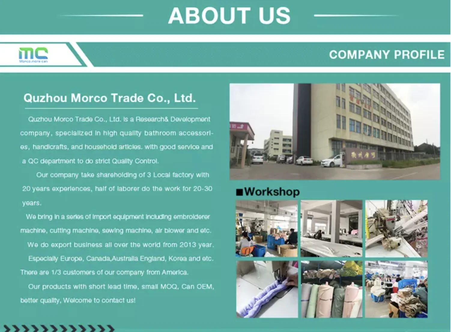 We are based in Zhejiang, China, start from 2015,sell to Central America(15.00%),Southern Europe(10.00%),Eastern Europe(10.00%),Northern Europe(10.00%),Western Europe(10.00%),South Asia(5.00%),Mid East(5.00%),Southeast Asia(5.00%),North America(5.00%),South America(5.00%),Eastern Asia(5.00%). There are total about 51-100 people in our office.